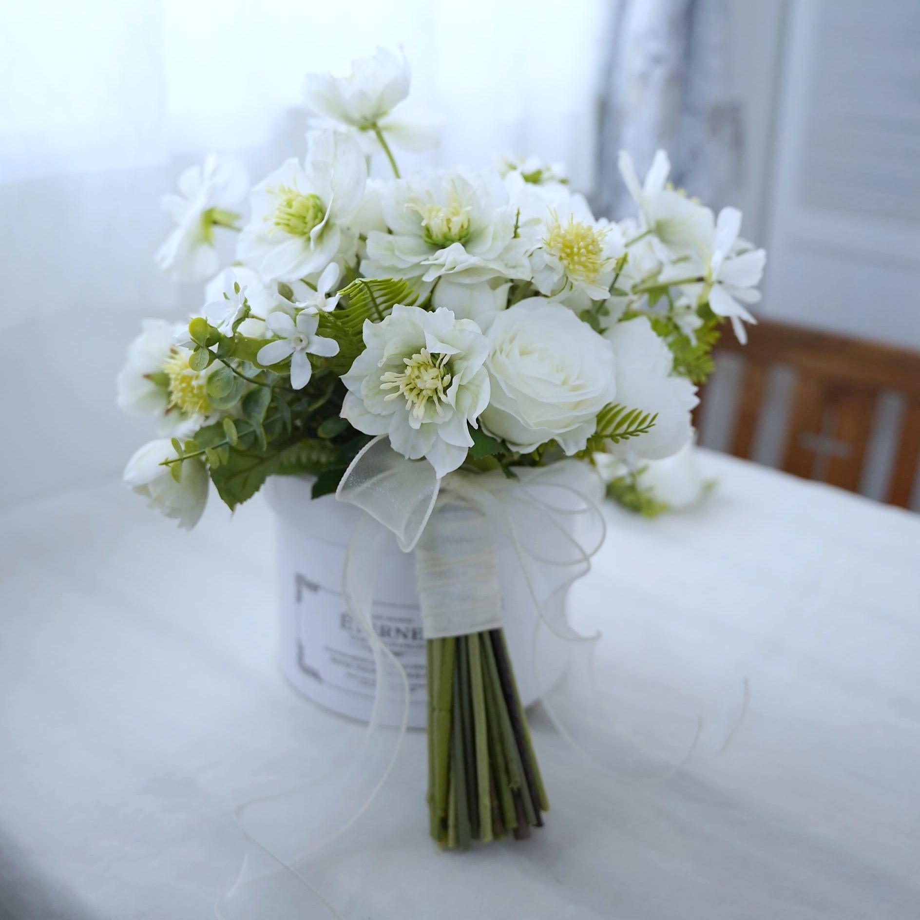 ホワイトグリーンのブーケはウェディングドレスはもちろん、