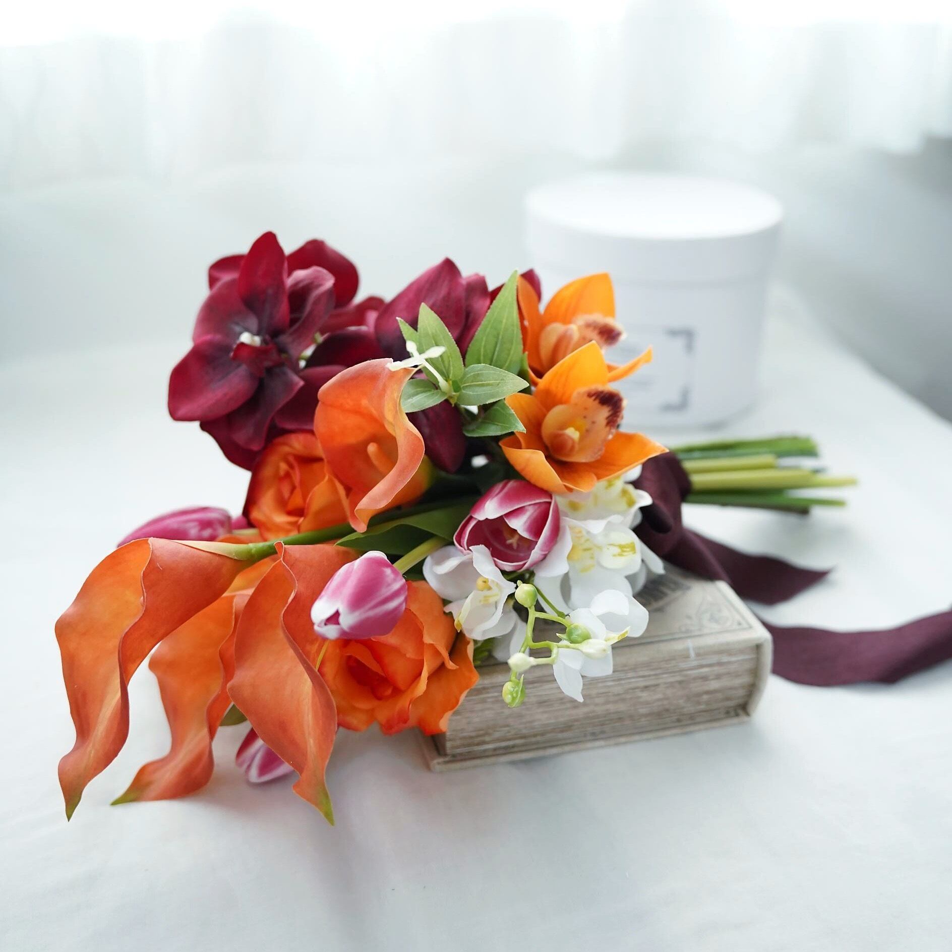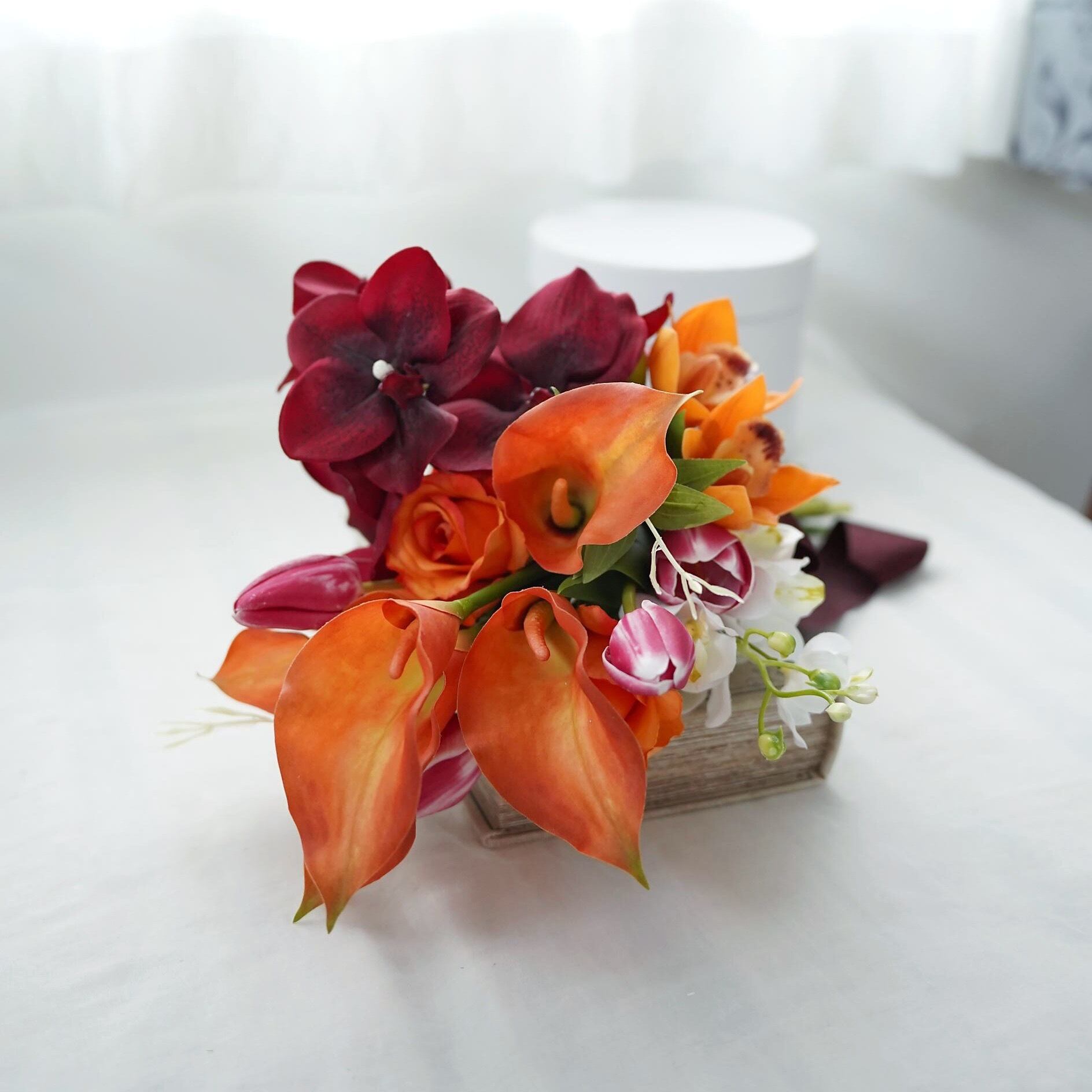 オレンジとボルドーのアームブーケ ウェディングブーケ