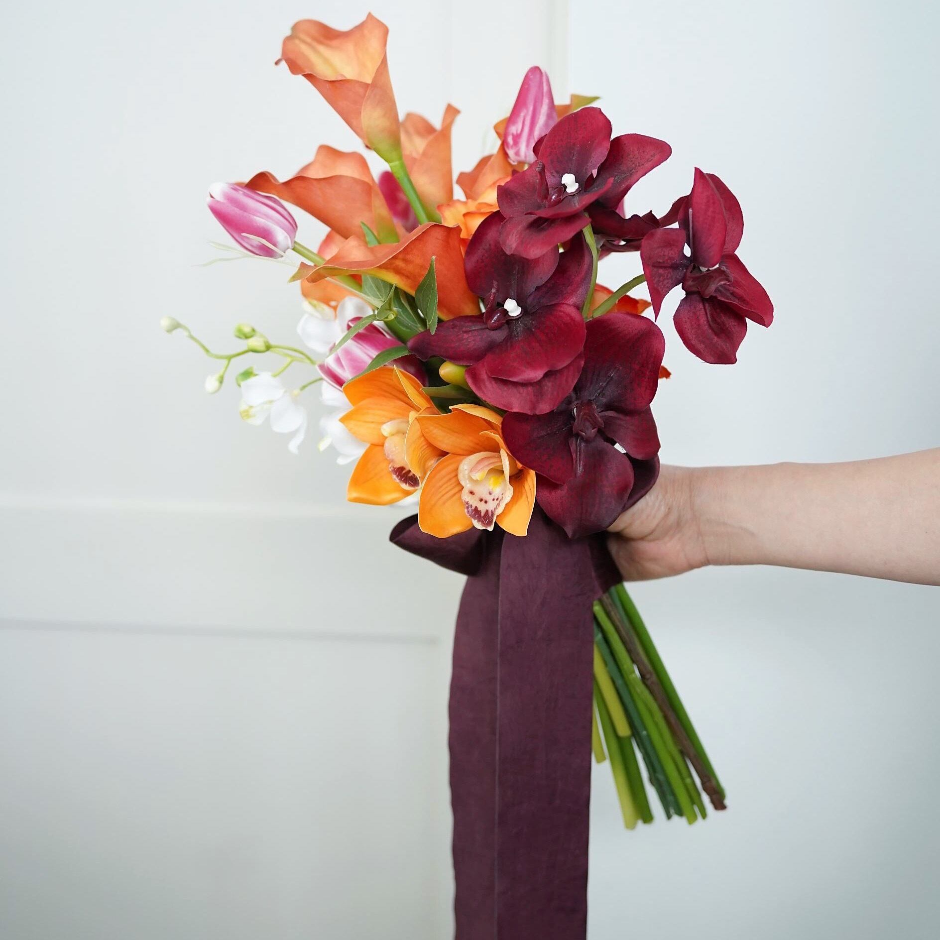 オレンジ色のカラー、胡蝶蘭など3種類の蘭とチューリップの