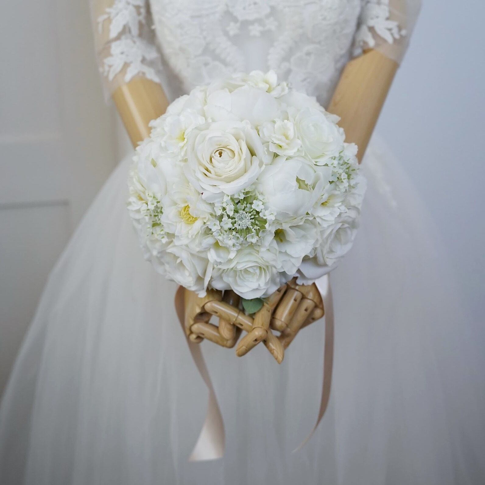 高品質のアーティフィシャルフラワーで束ねたウェディングブーケです。
