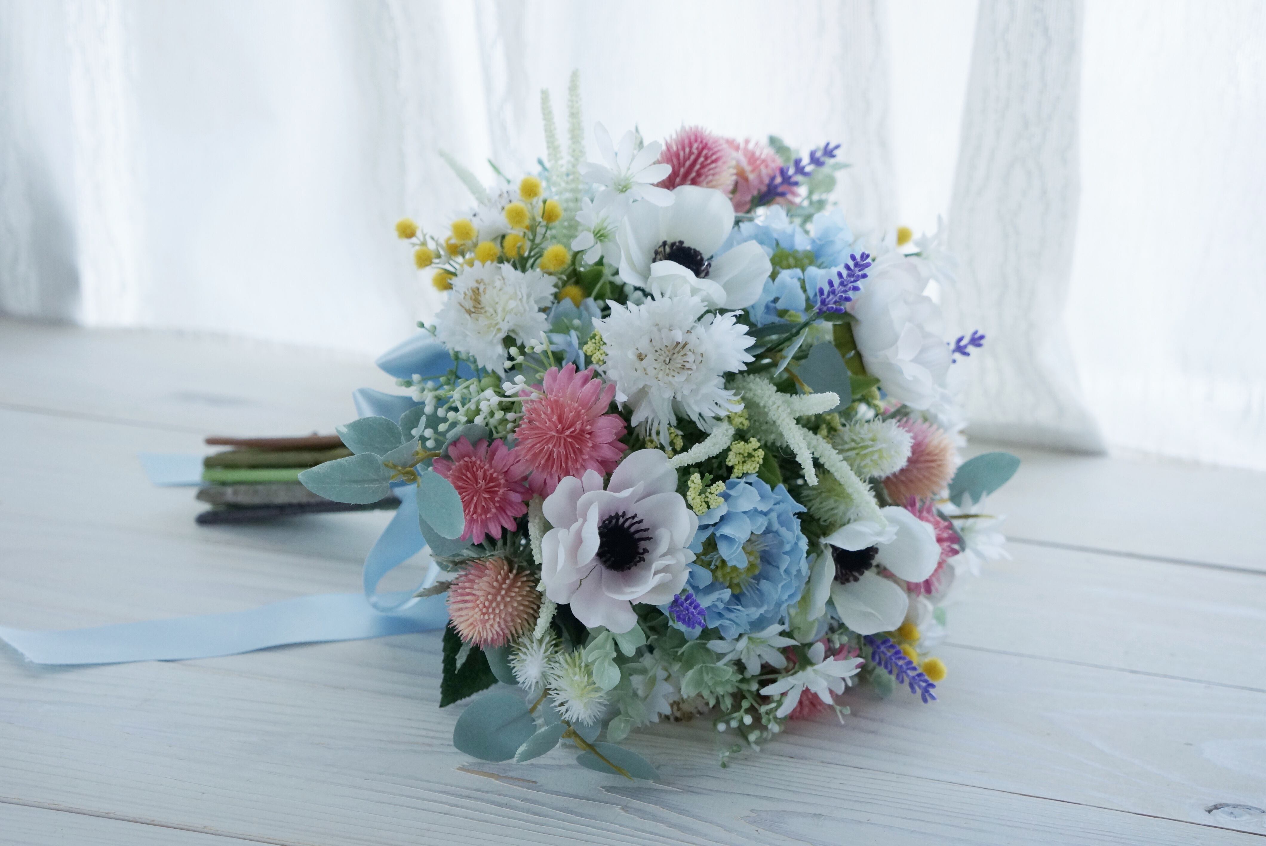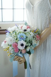 明るいお色目のお花をたくさん合わせてナチュラルに束ねました。