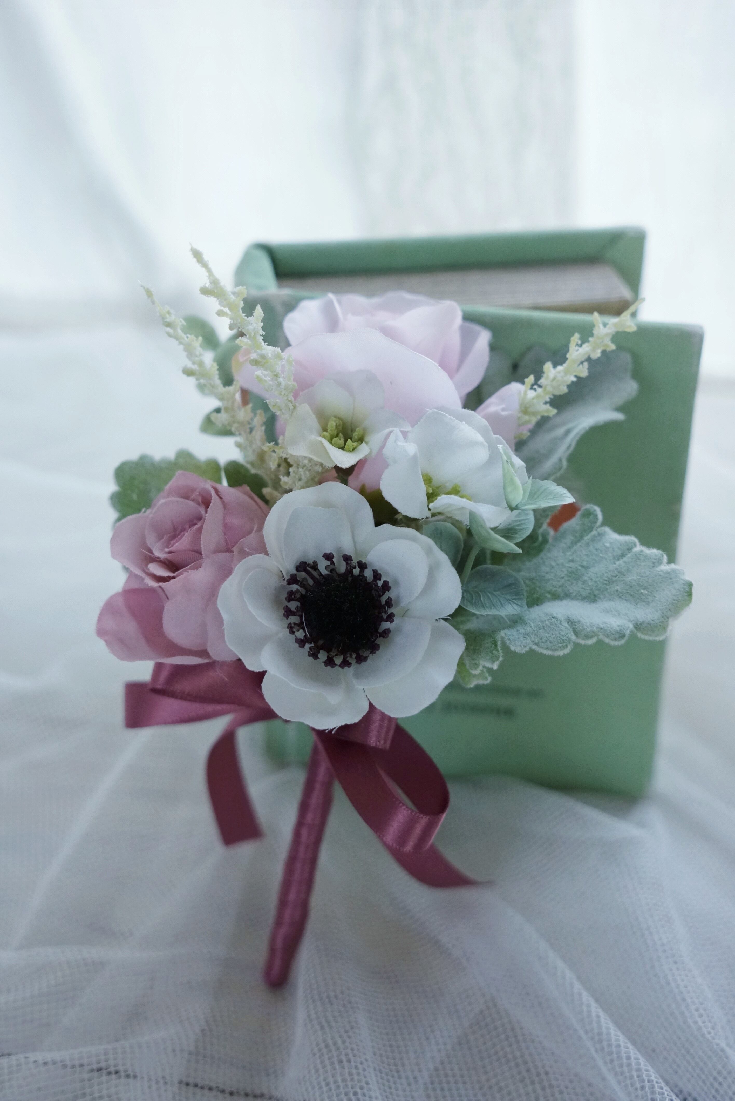 少しずつお色の違う大小のピンクローズにアネモネを3輪ポイントに入れました。