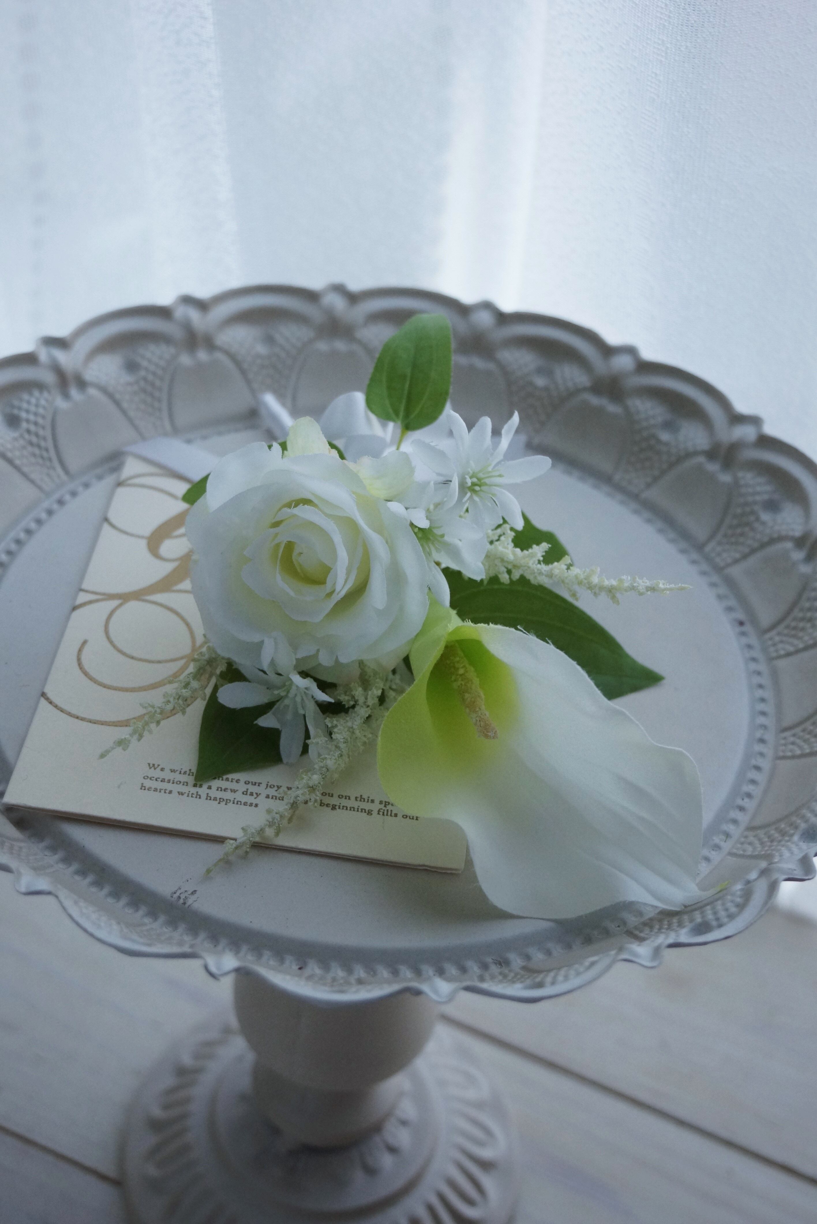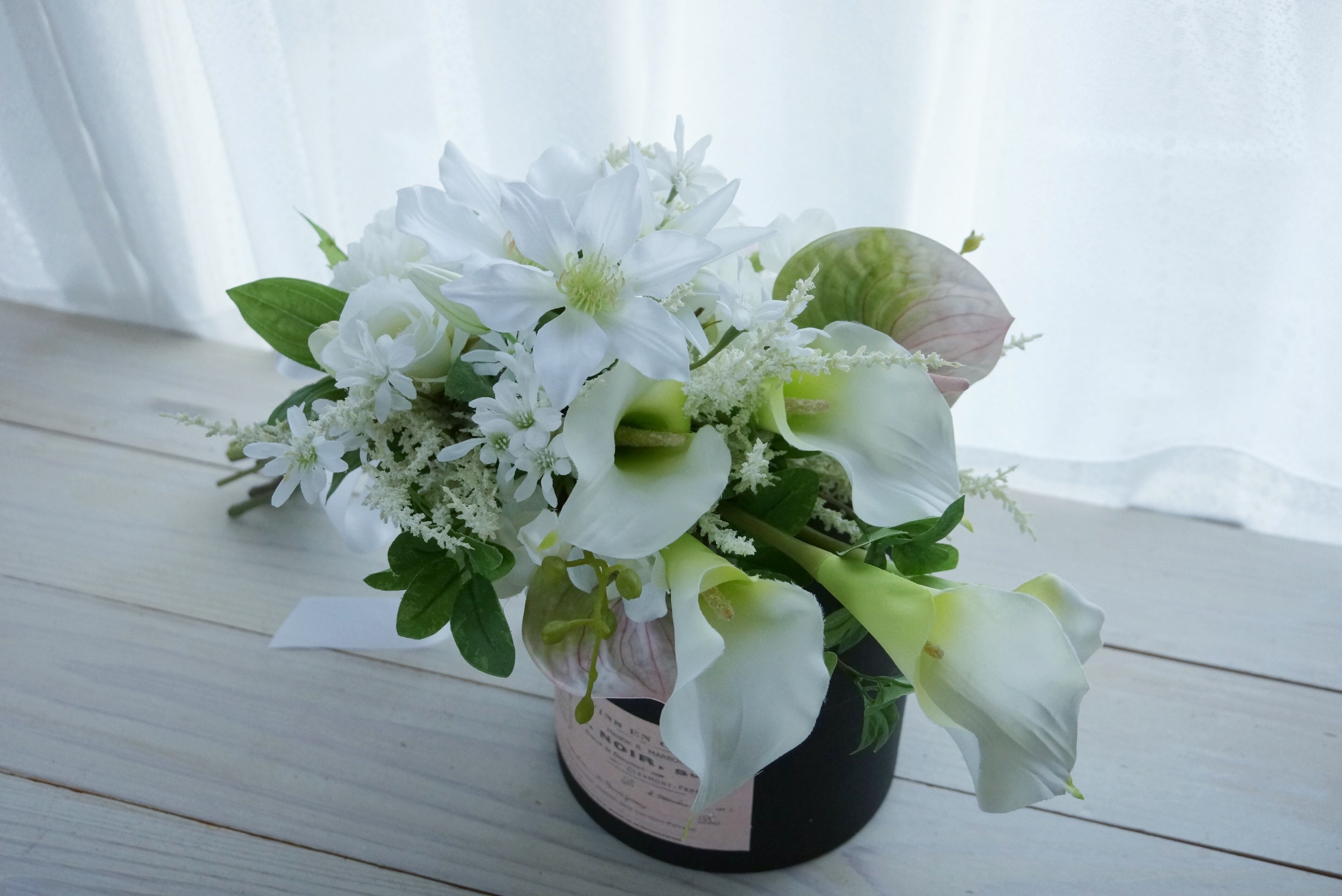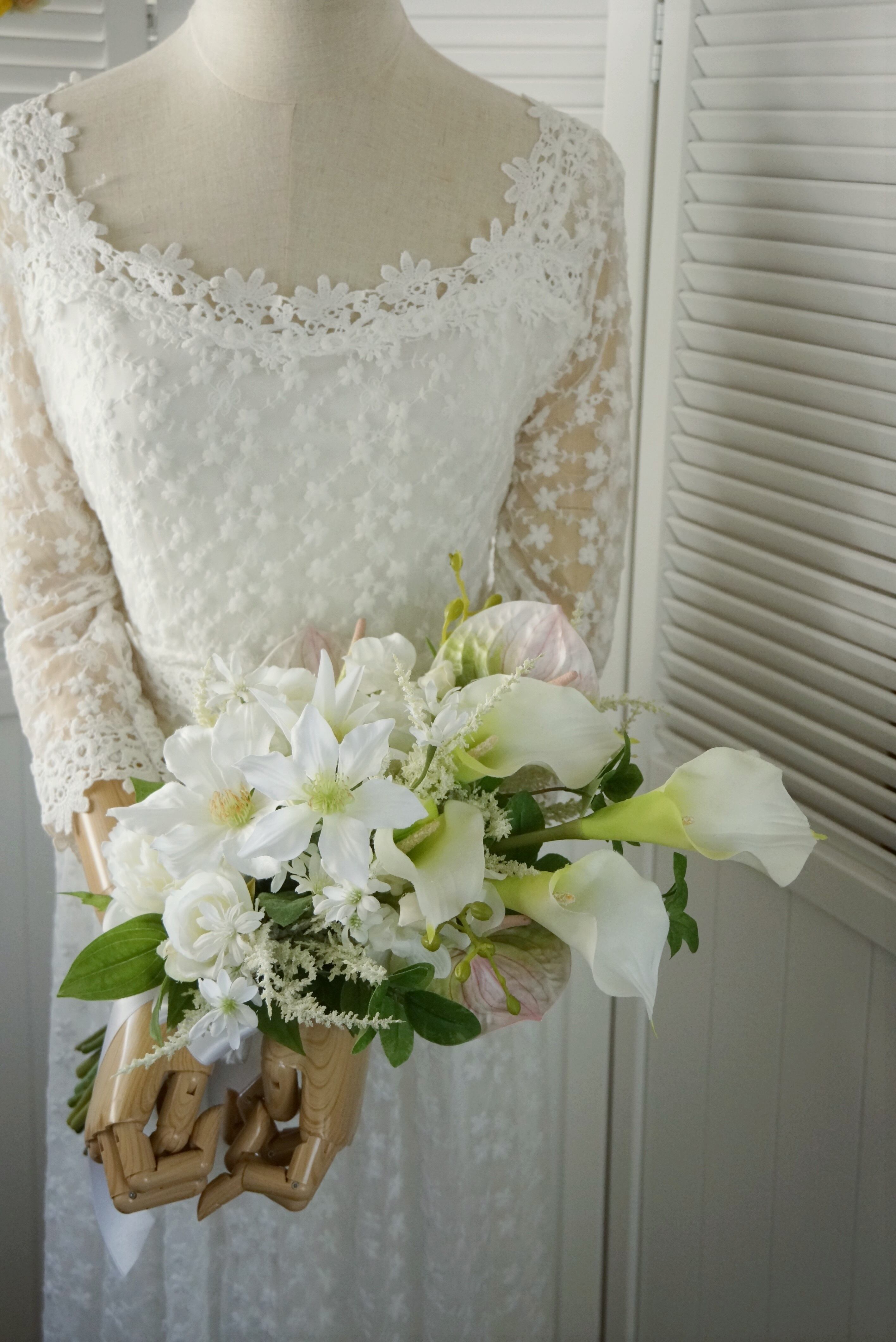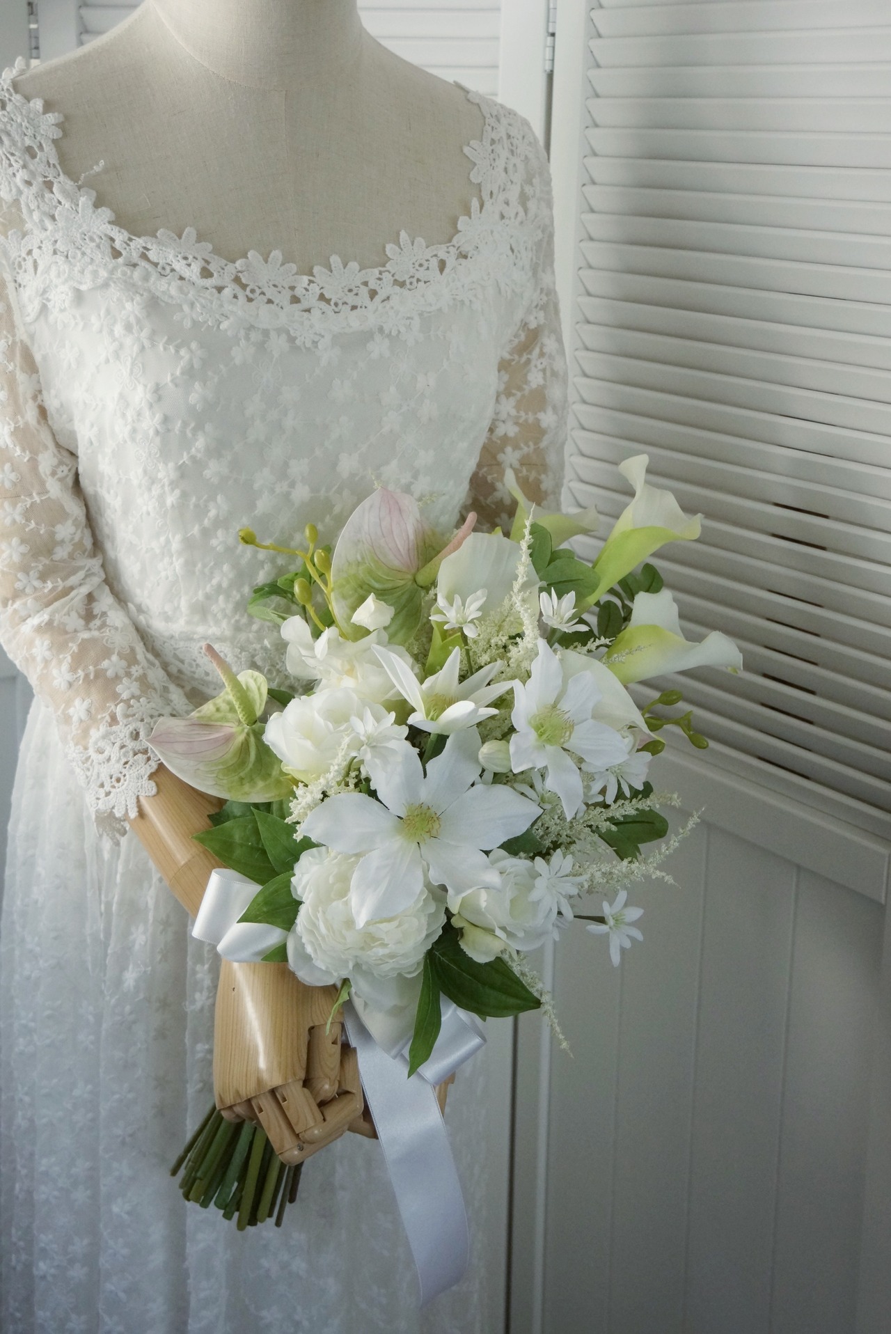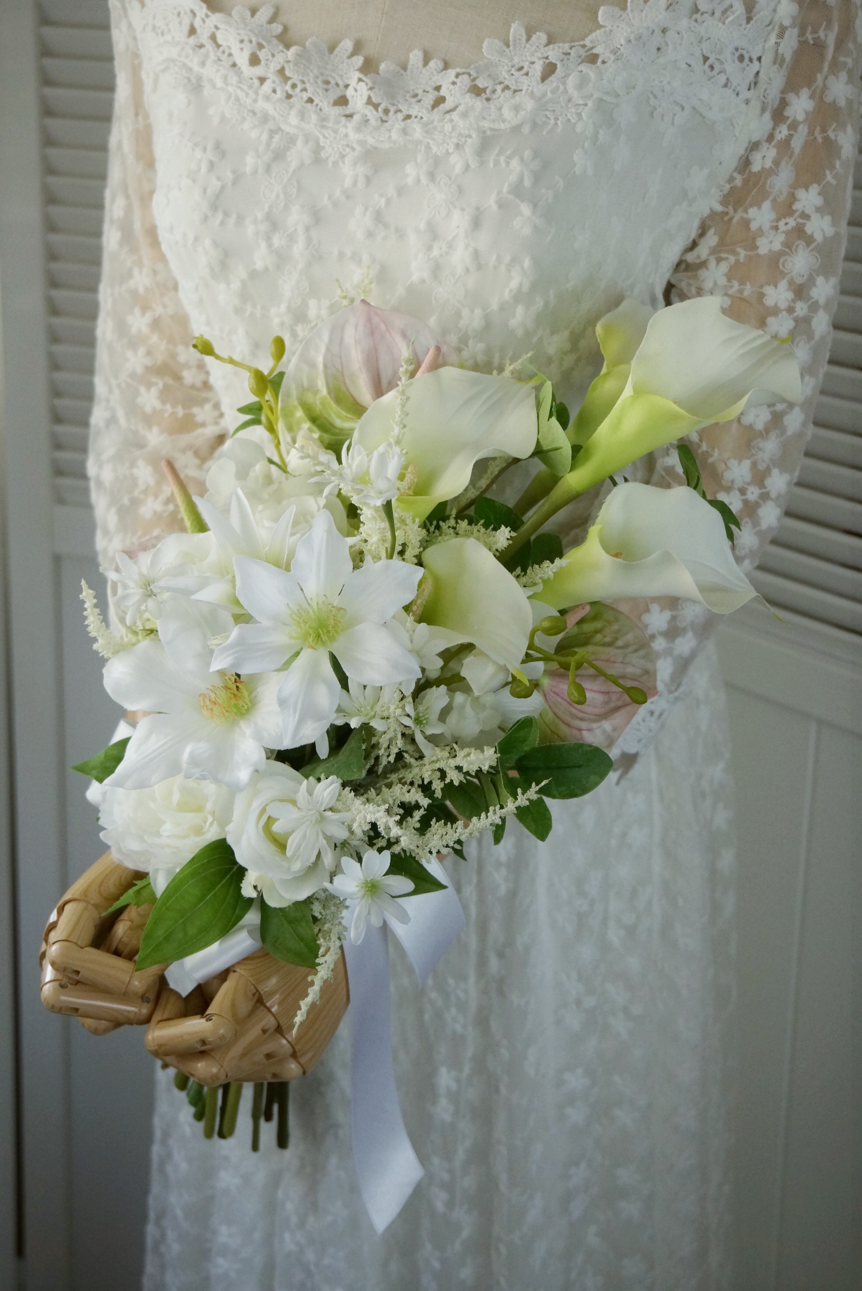 ホワイトグリーンのカラーとクレマチス、アンスリウム、ローズ