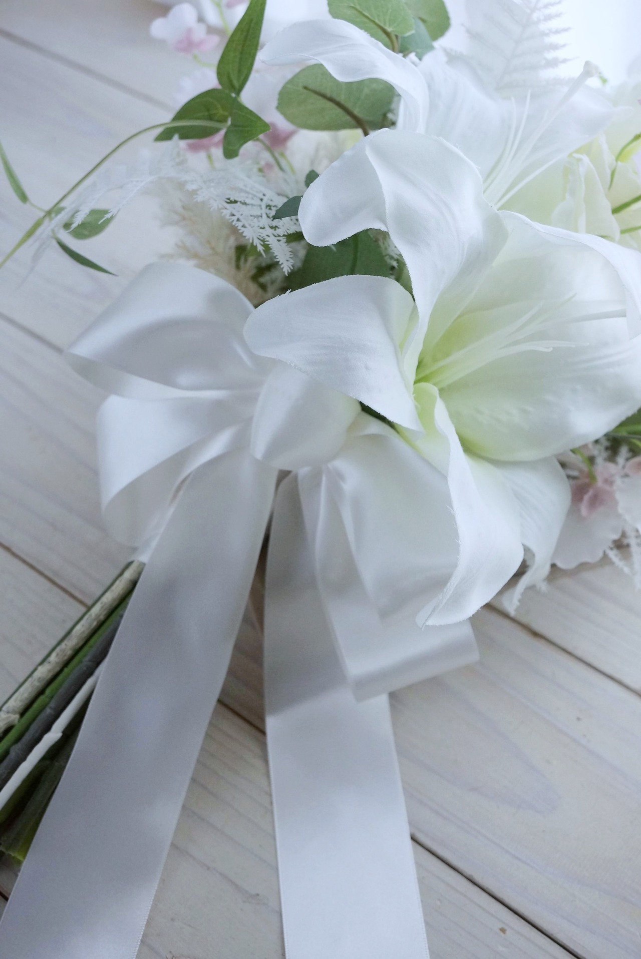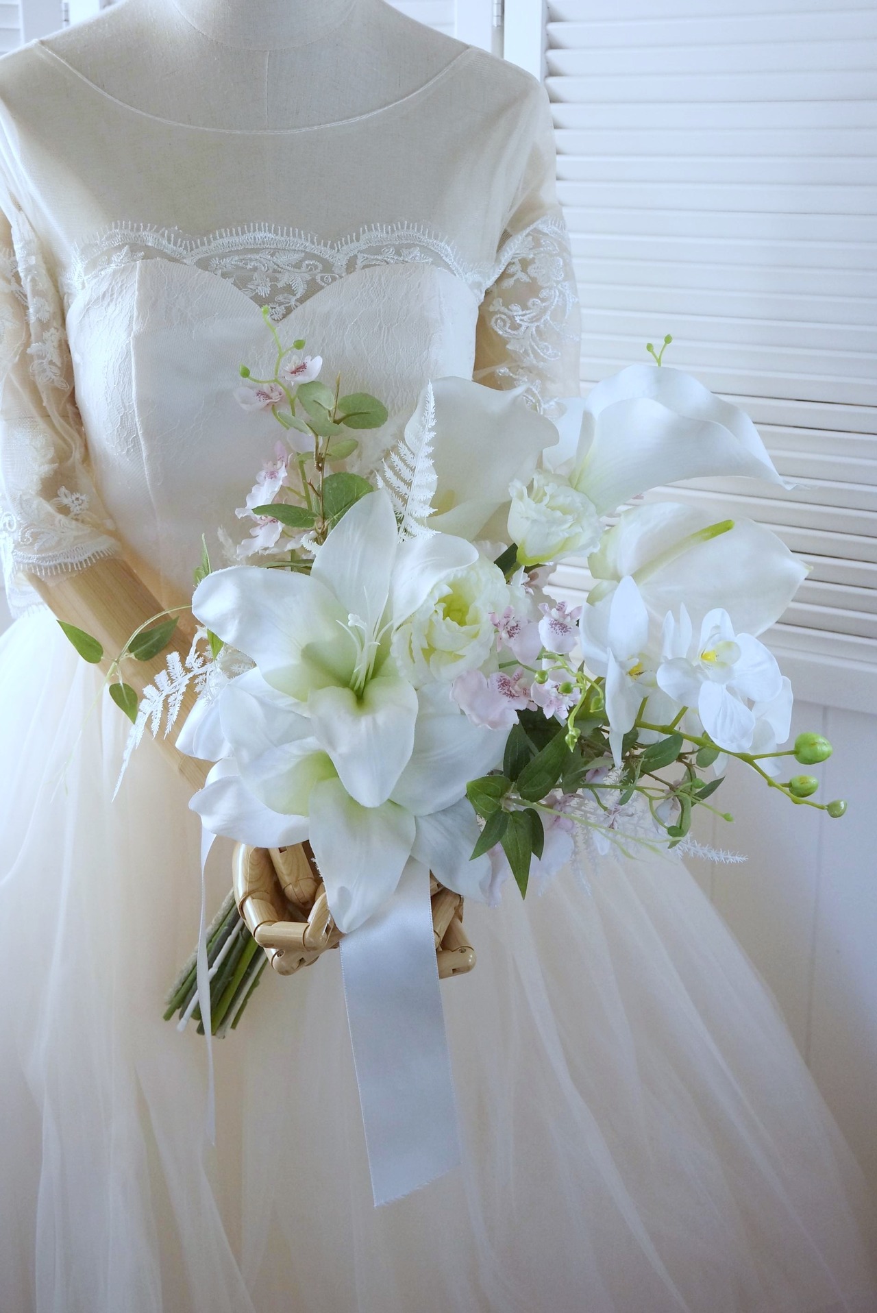 アーティフィシャルフラワーはとても丈夫ですので、前撮り・挙式・後撮りと何度でもご使用いただけます。 海外ウェデイングにもお持ちいただけます。
