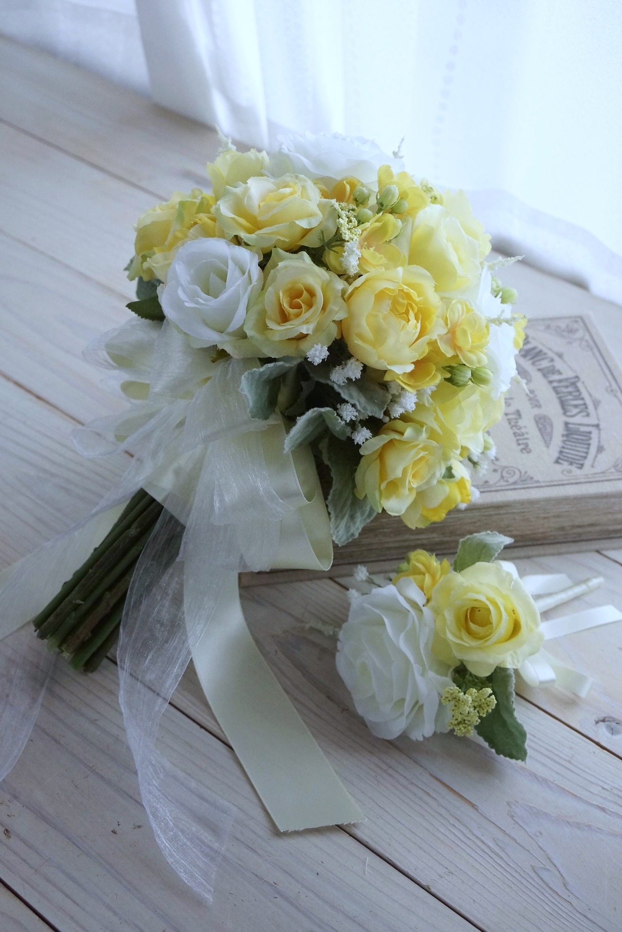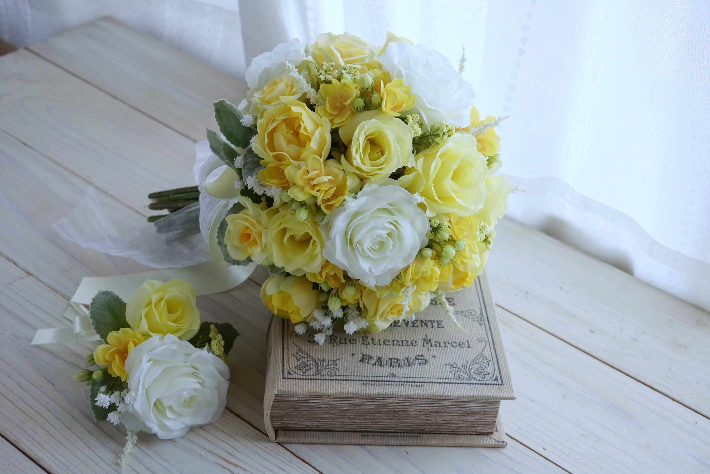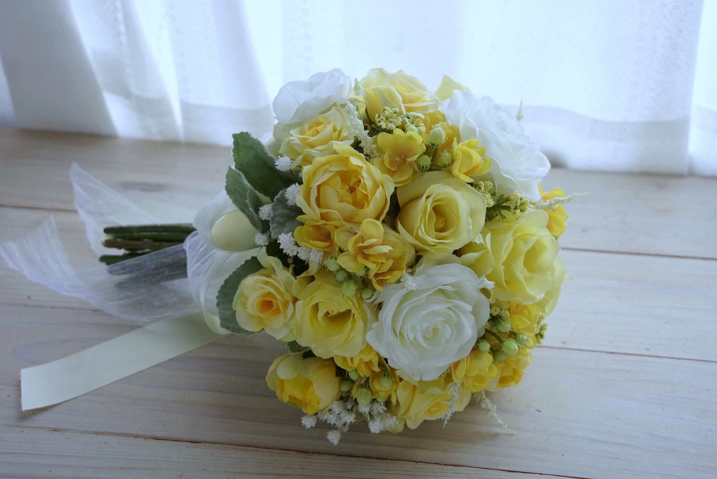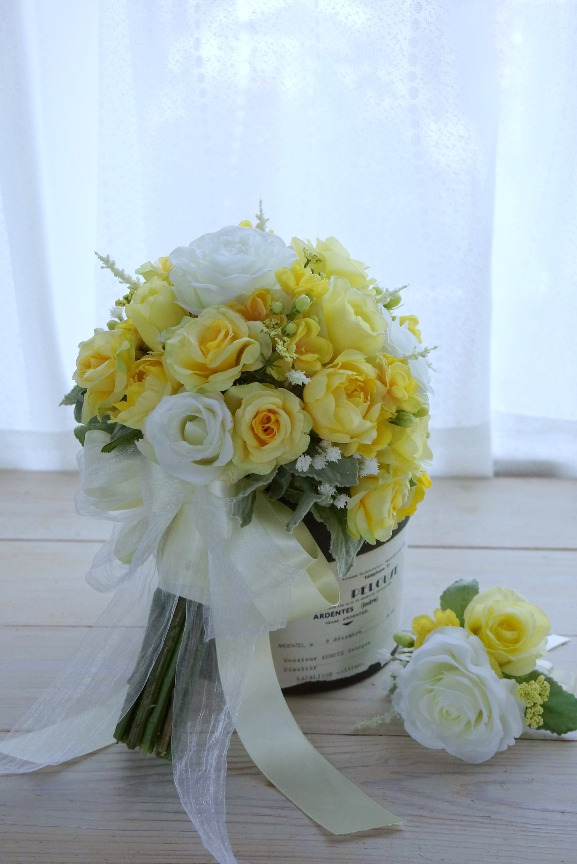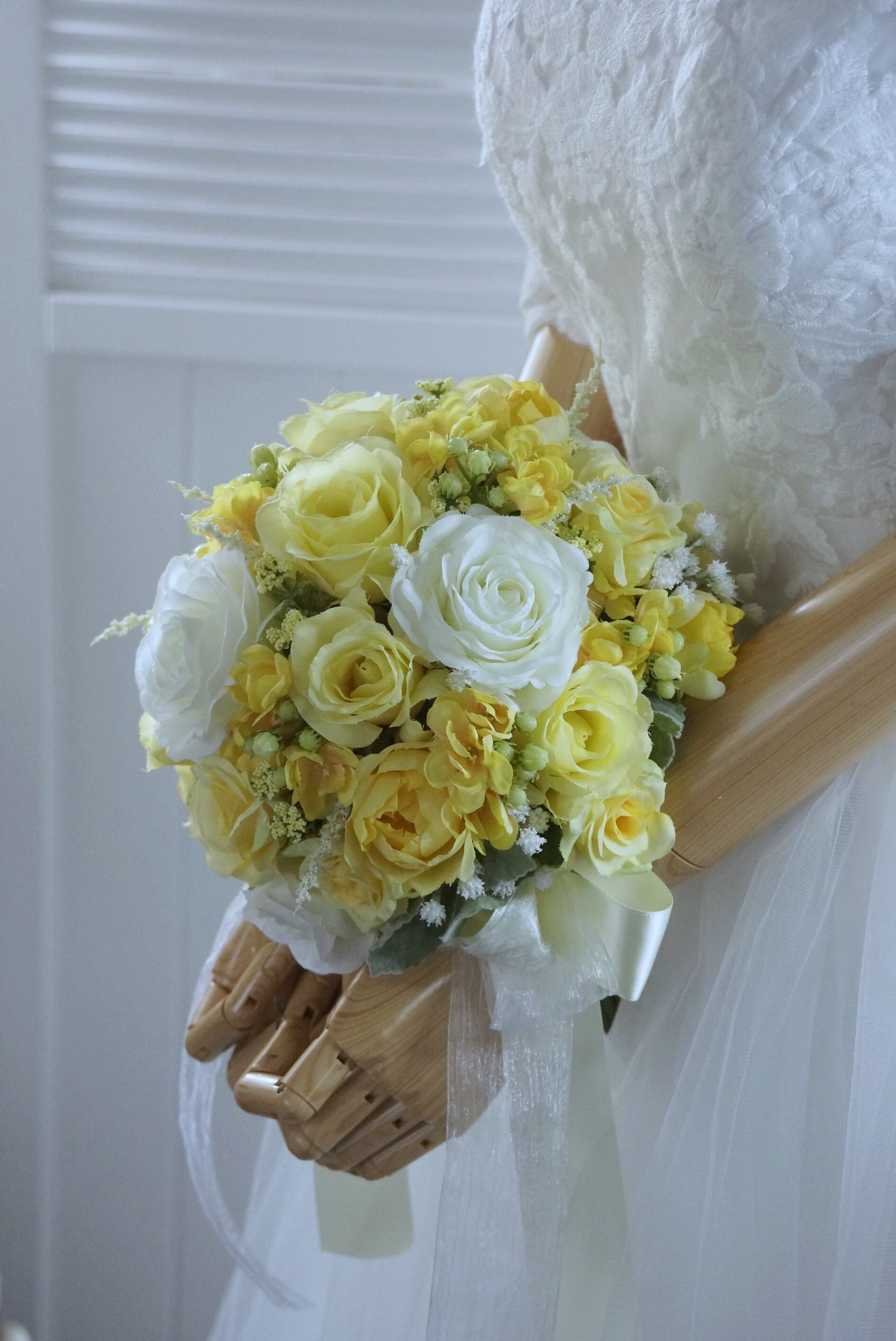 イエローホワイトローズのラウンドブーケ ウェデイングブーケ