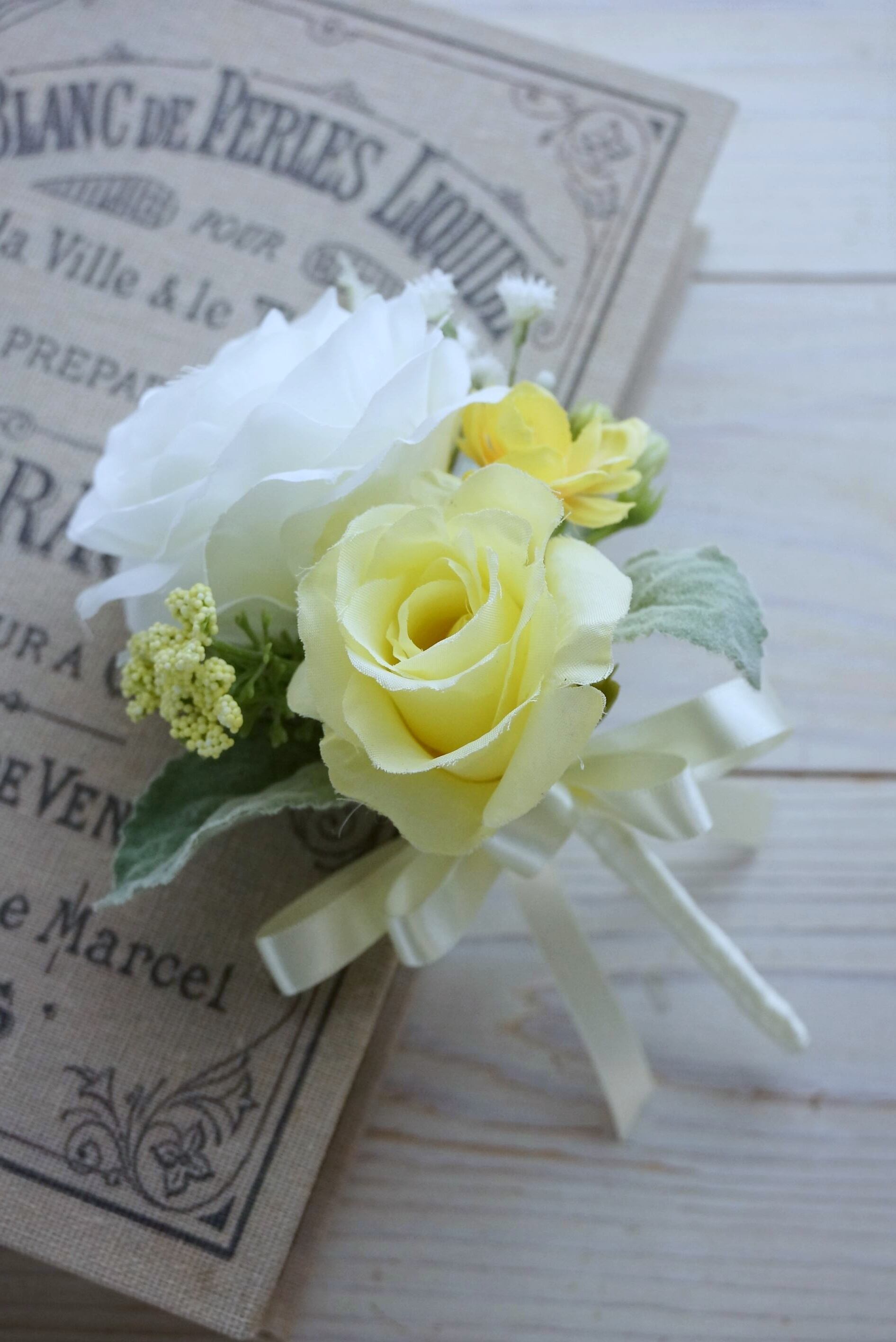 3種類の黄色のローズと2種類の白のローズに小花とグリーンで