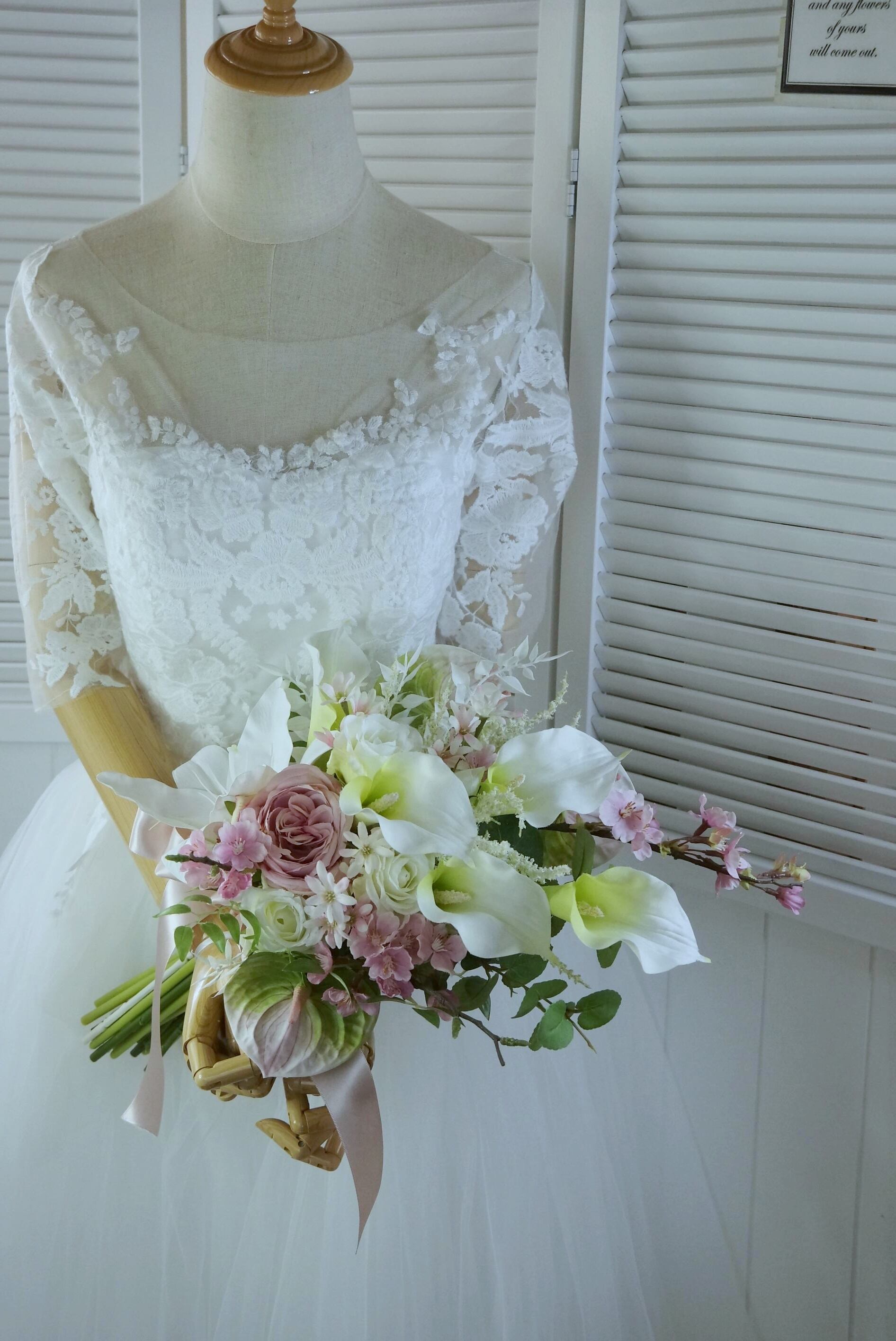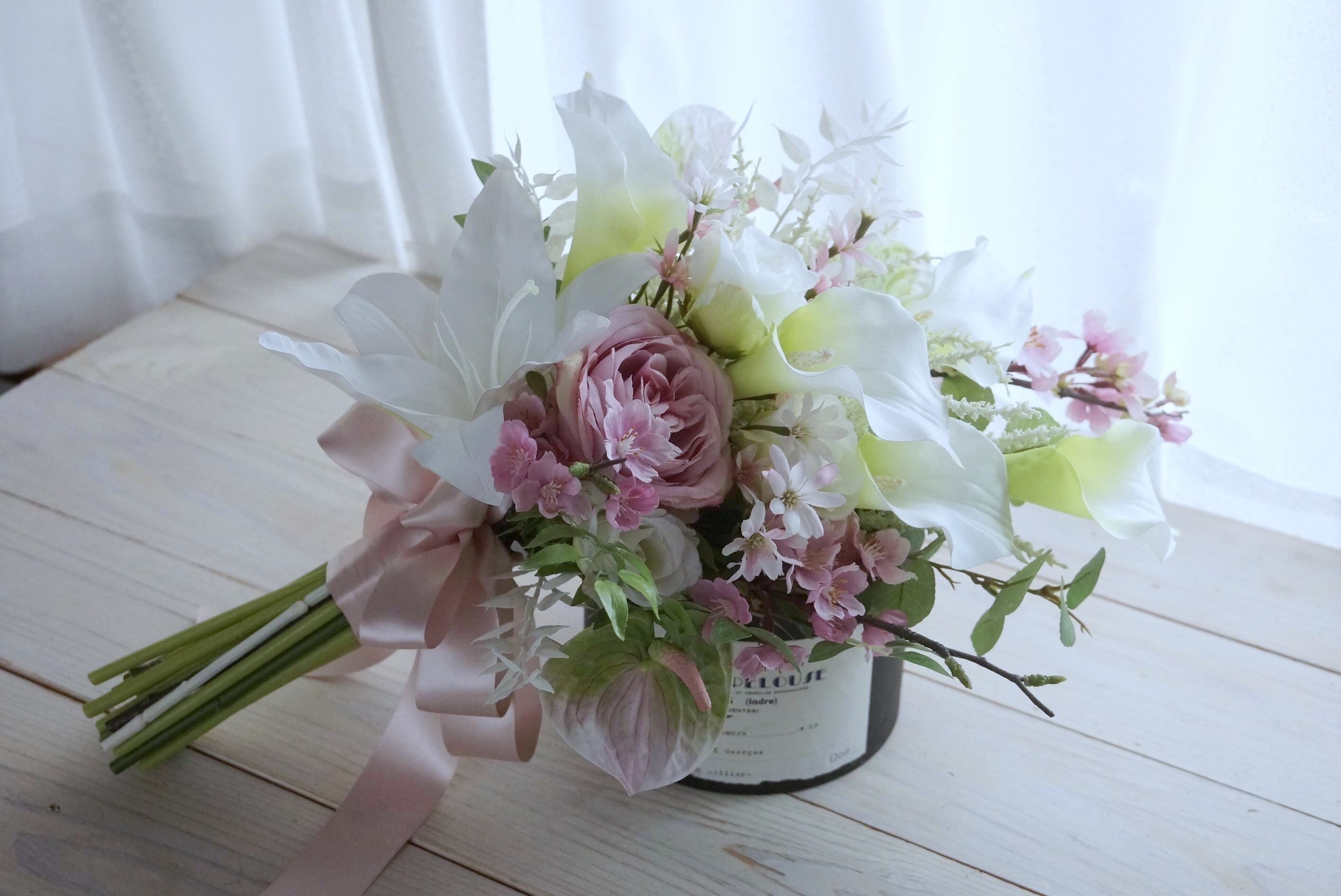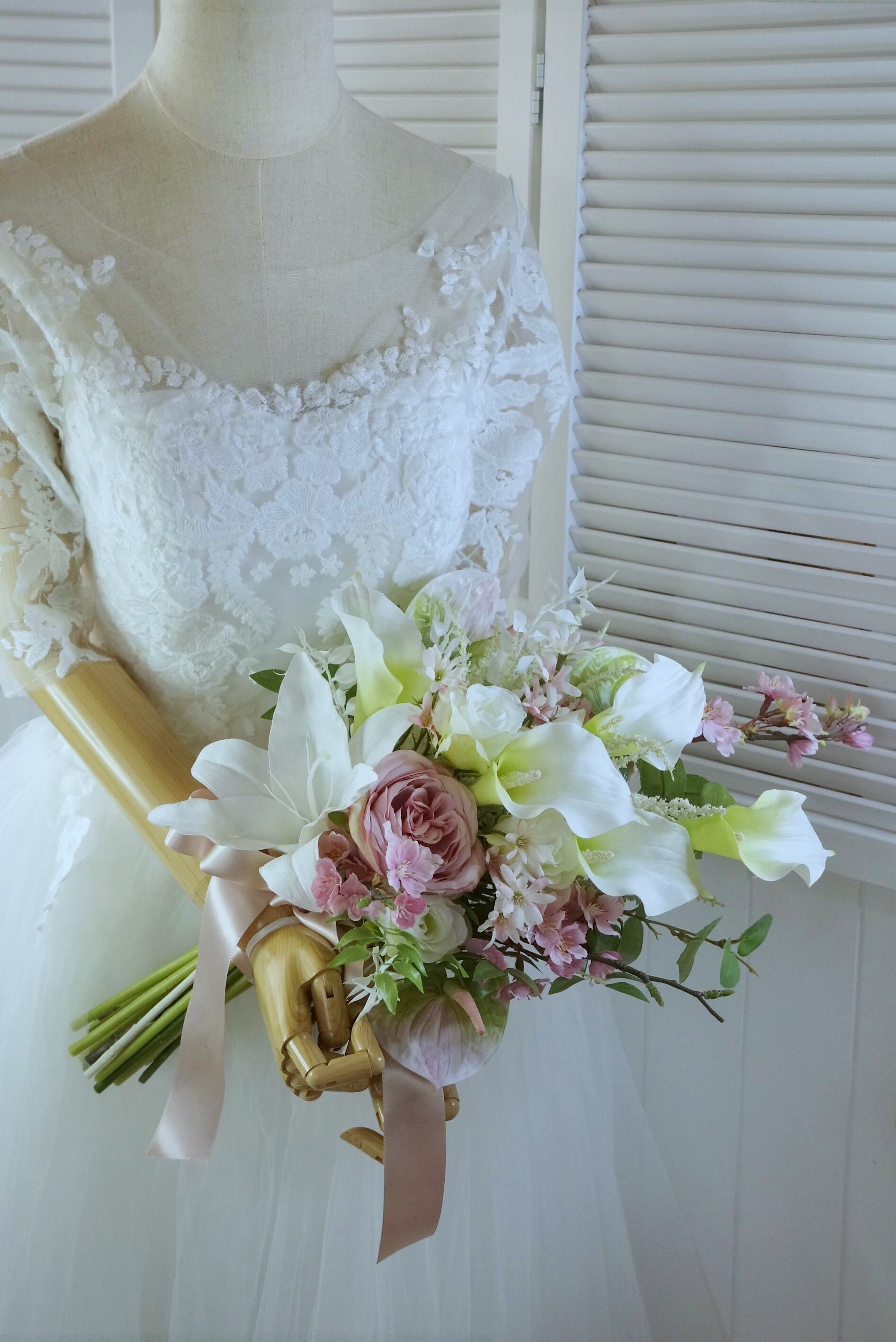 高品質のアーティフィシャルフラワーで束ねたウェディングブーケです。