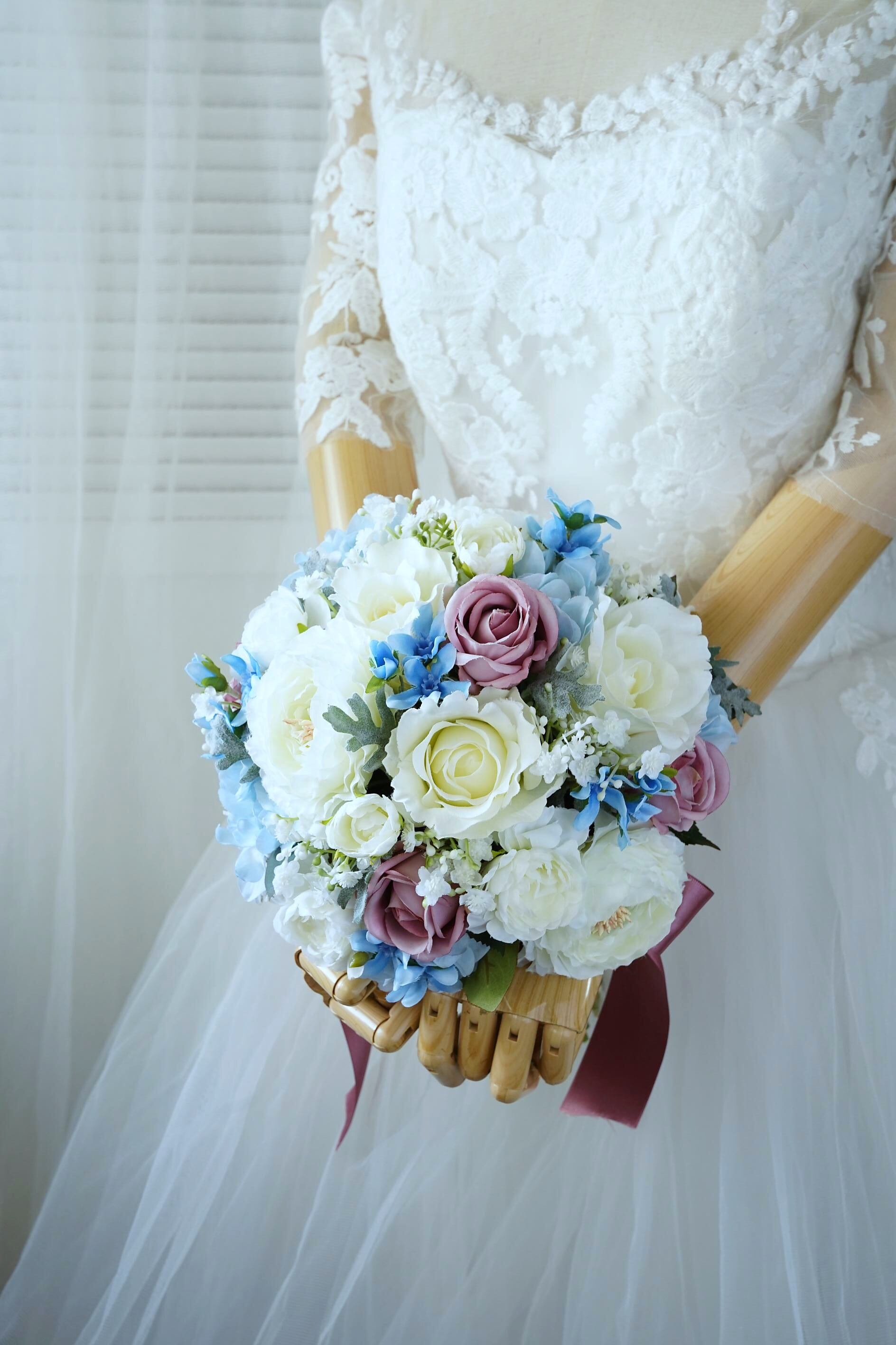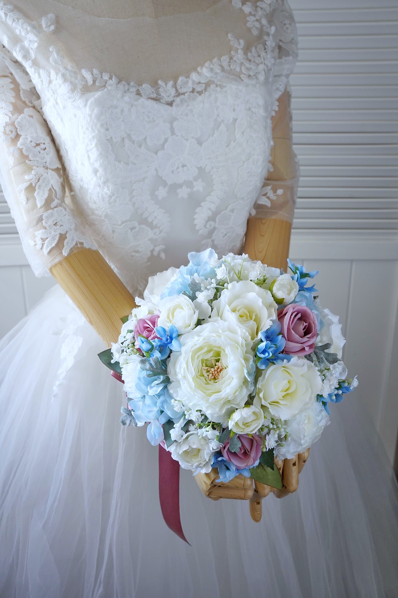 ホワイトブルーピンクのラウンドブーケ ウェディングブーケ