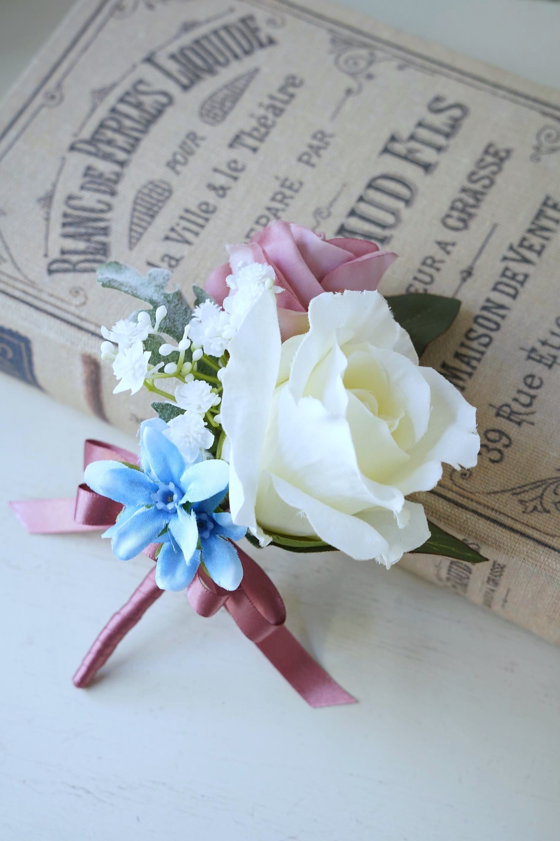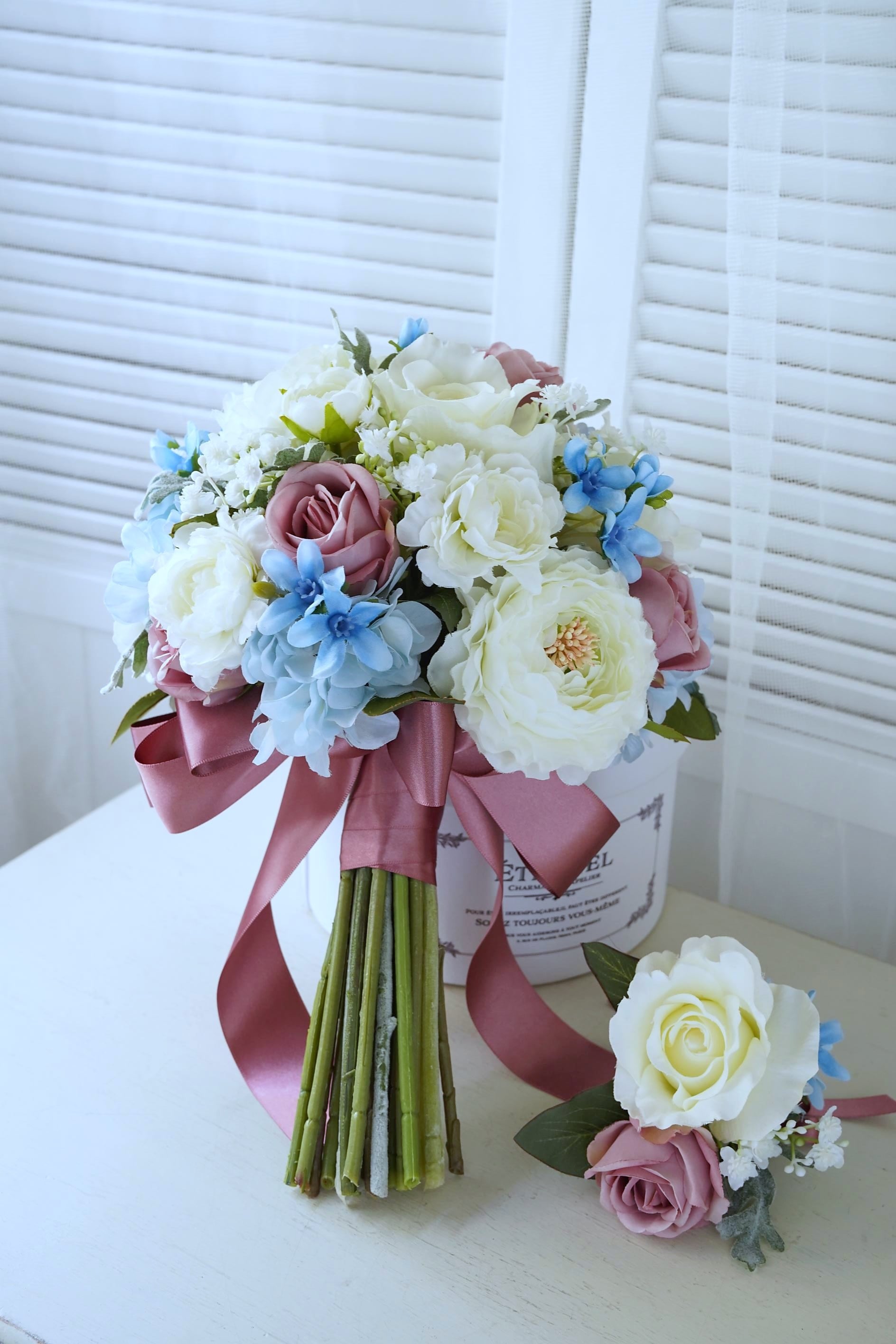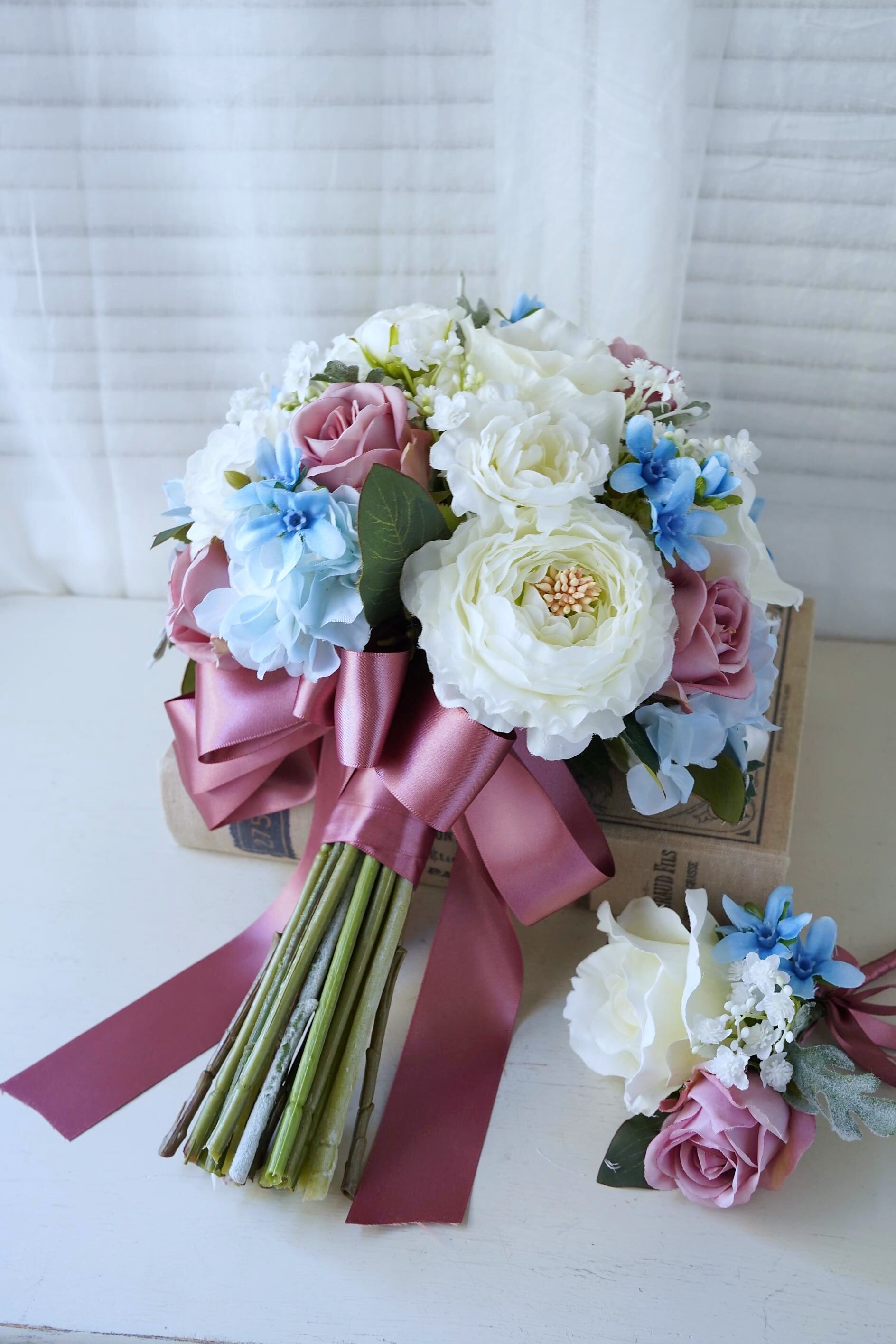 バラやラナンキュラスの白いお花をメインに水色とくすみピンクを加えました。