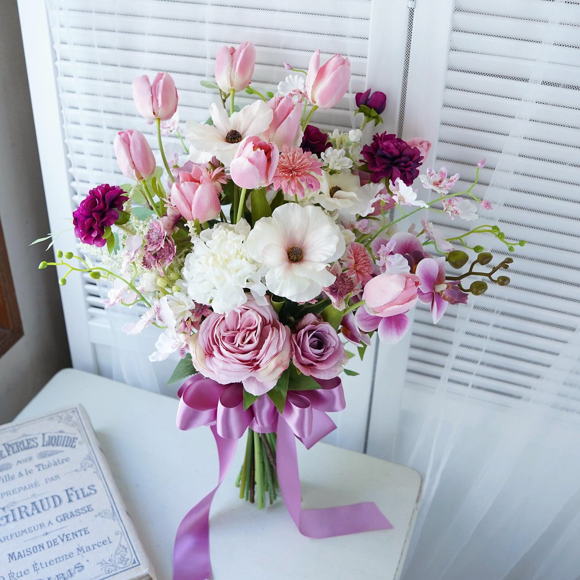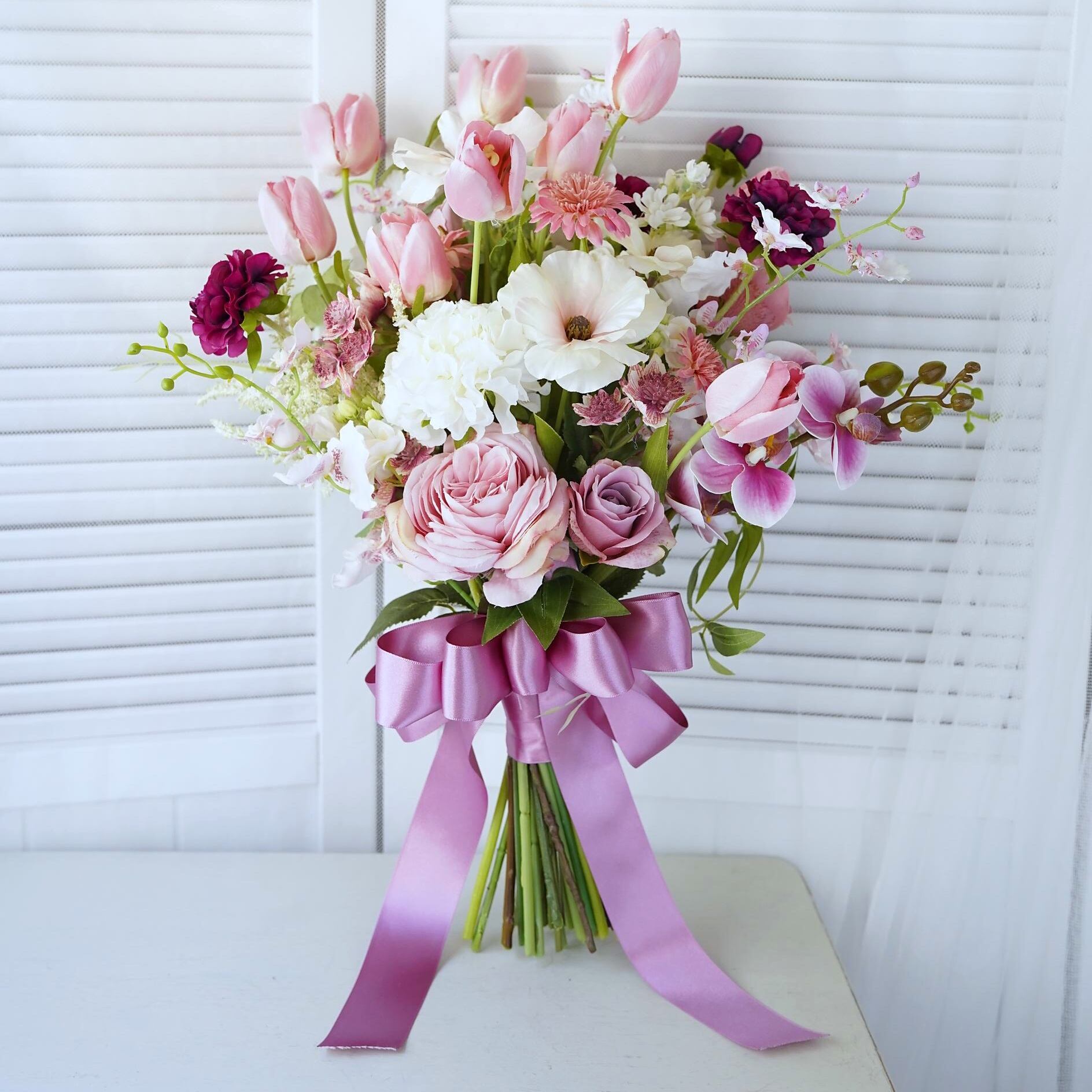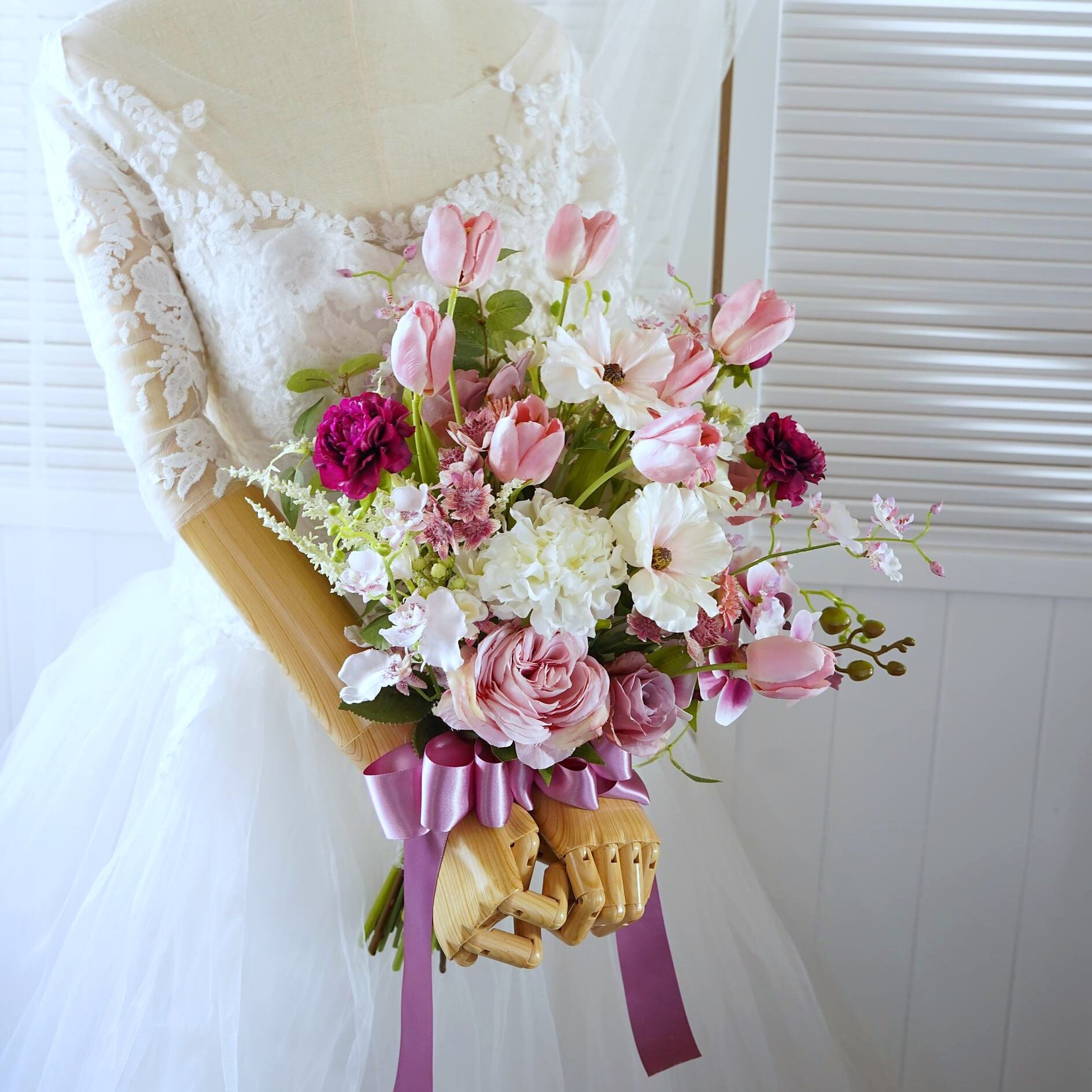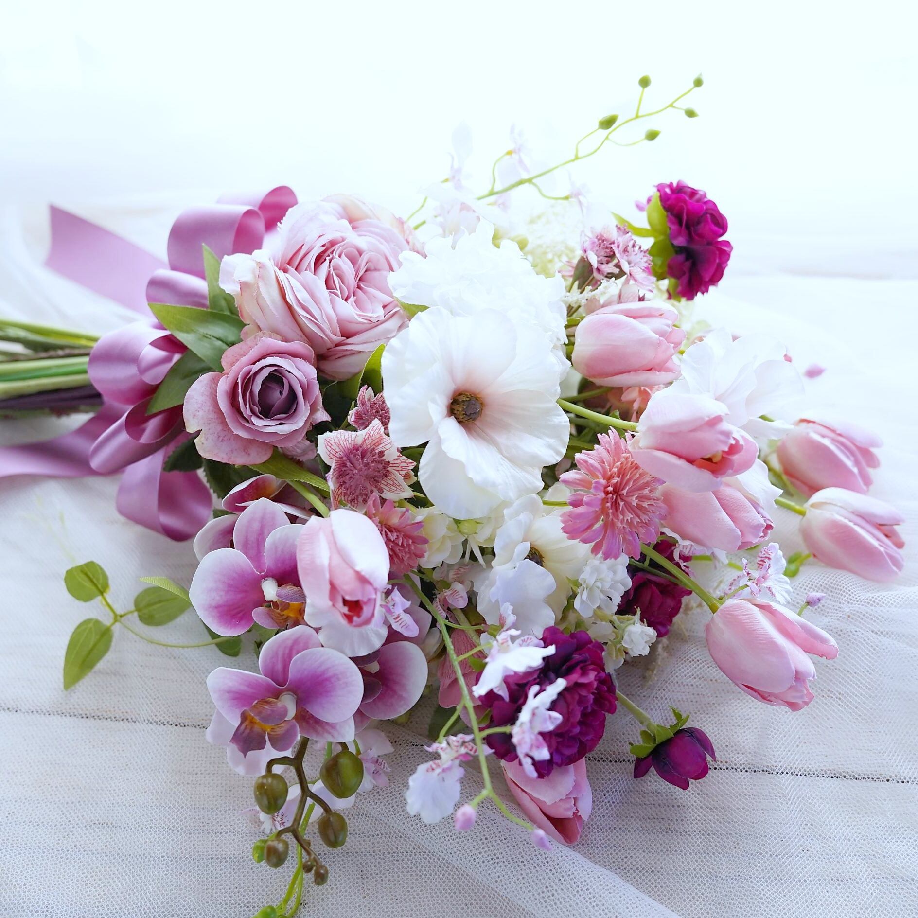 高品質のアーティフィシャルフラワーで束ねたウェディングブーケです。