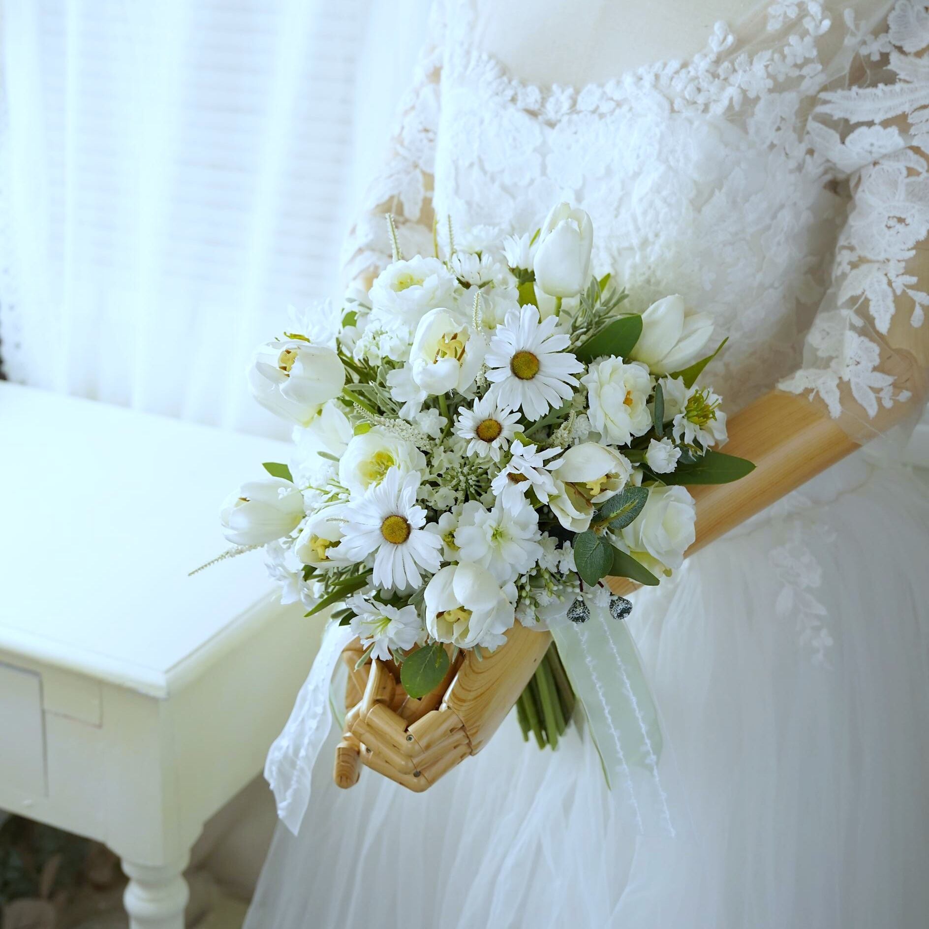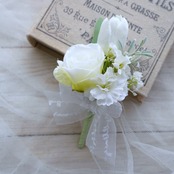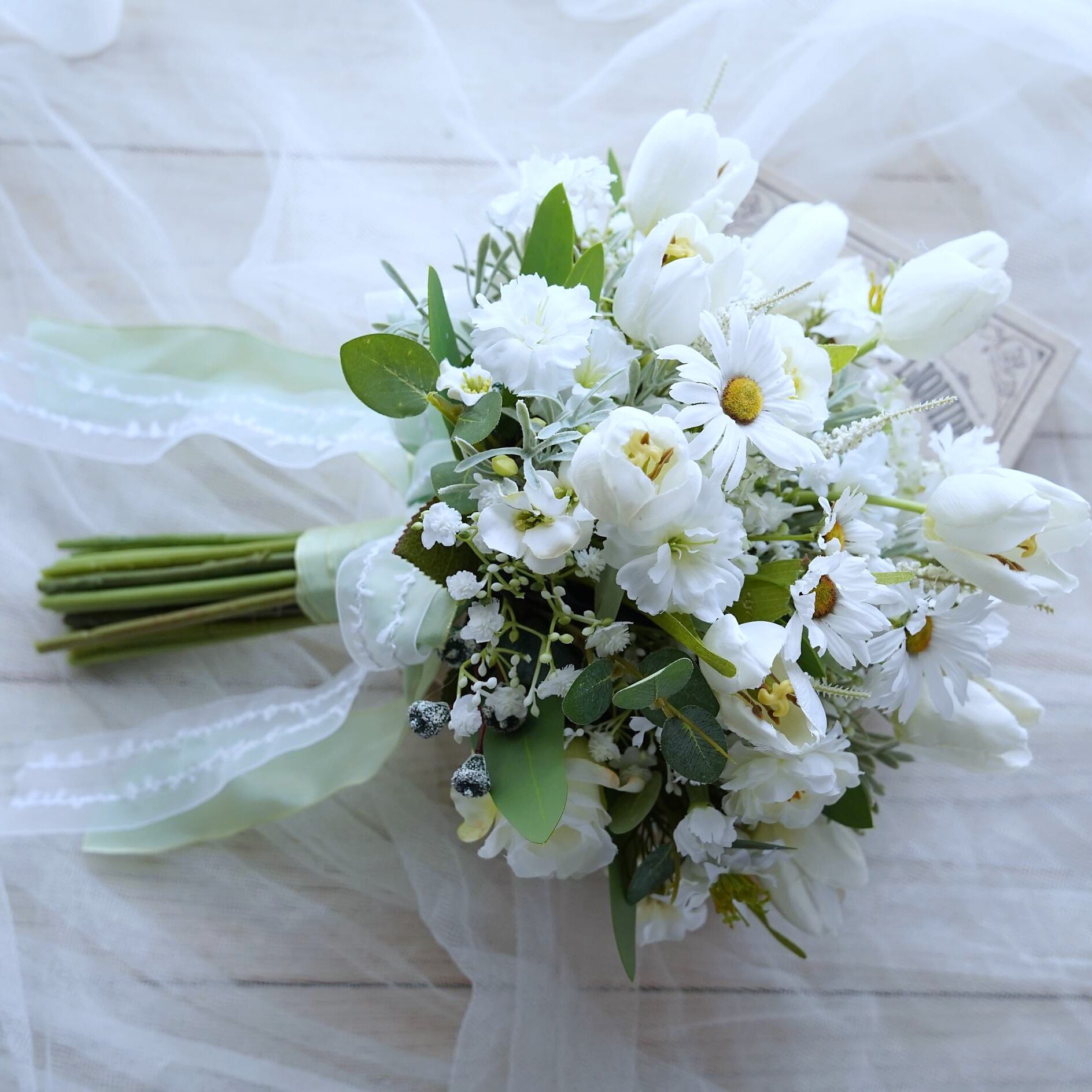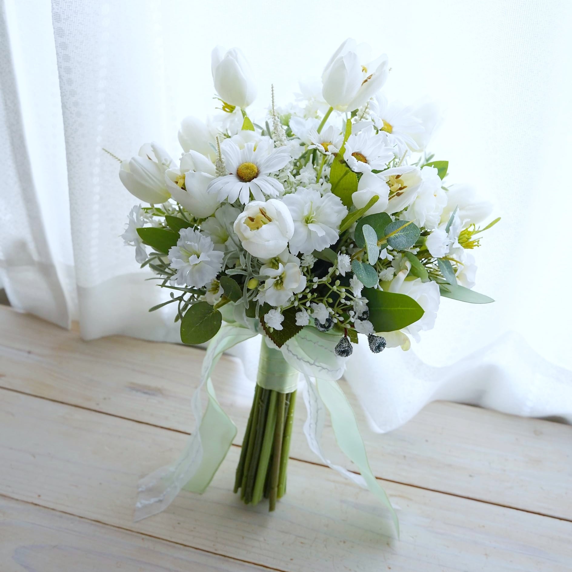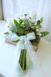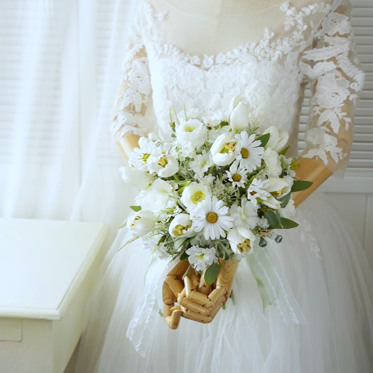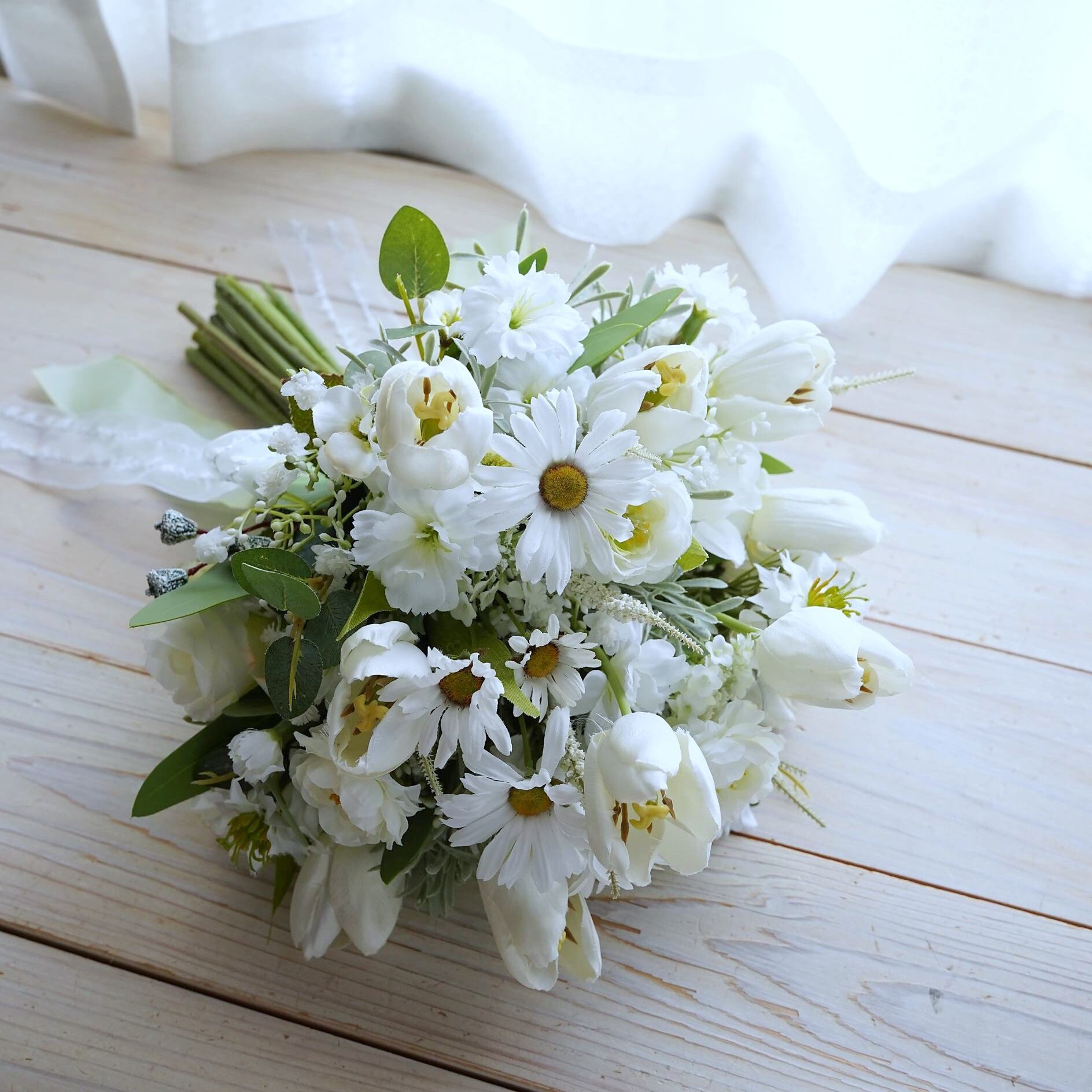 白いチューリップをメインに数種類の白いお花とグリーンで