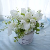 カラー、デルフィニウム、バラの白い3種類のお花にグリーンを2種類合わせました。