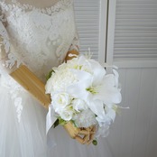 白いバラ、芍薬でラウンド型に束ねたブーケにカサブランカと胡蝶蘭を