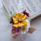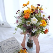 オレンジのコスモスにバラや小花など、たくさんの種類のお花とグリーンを合わせました。