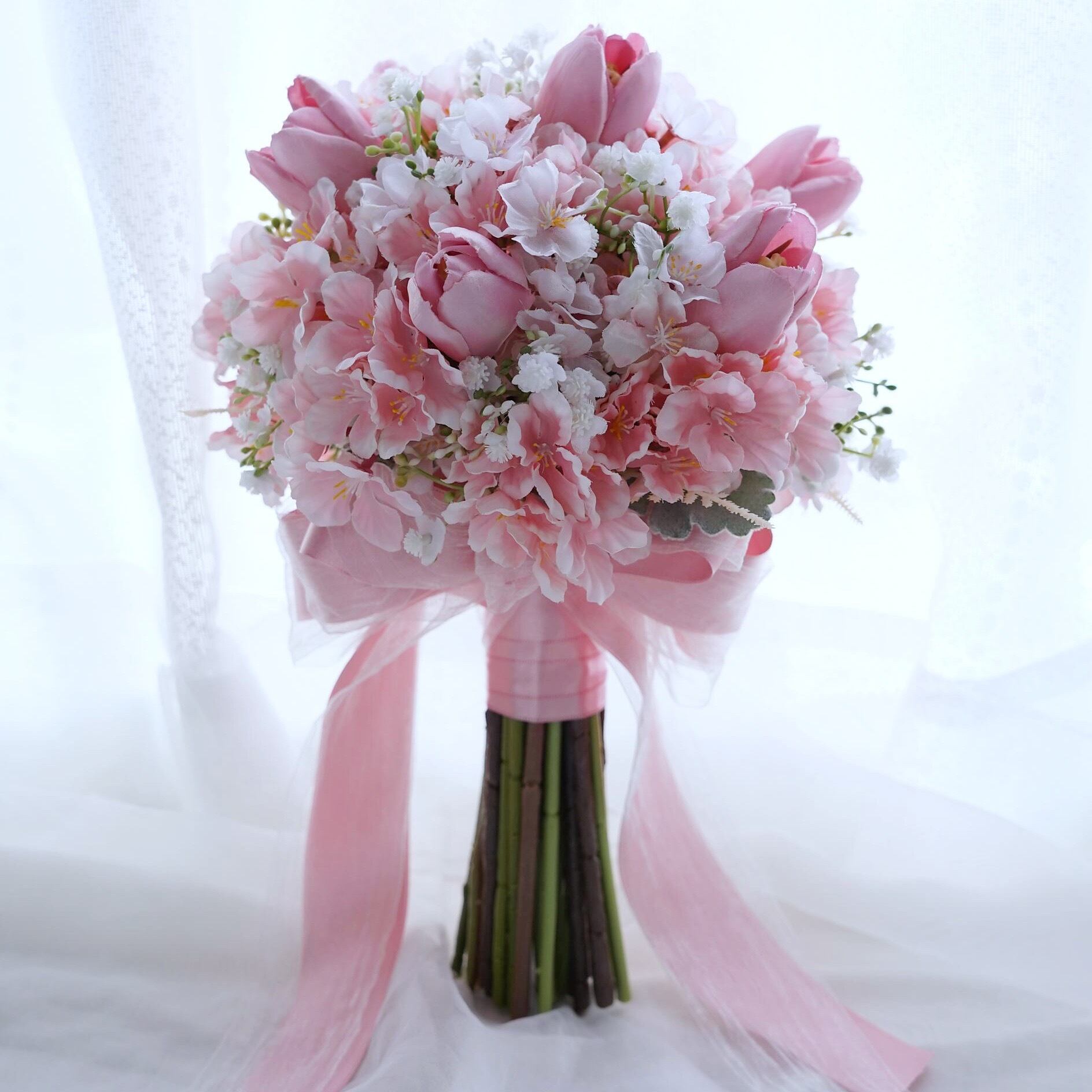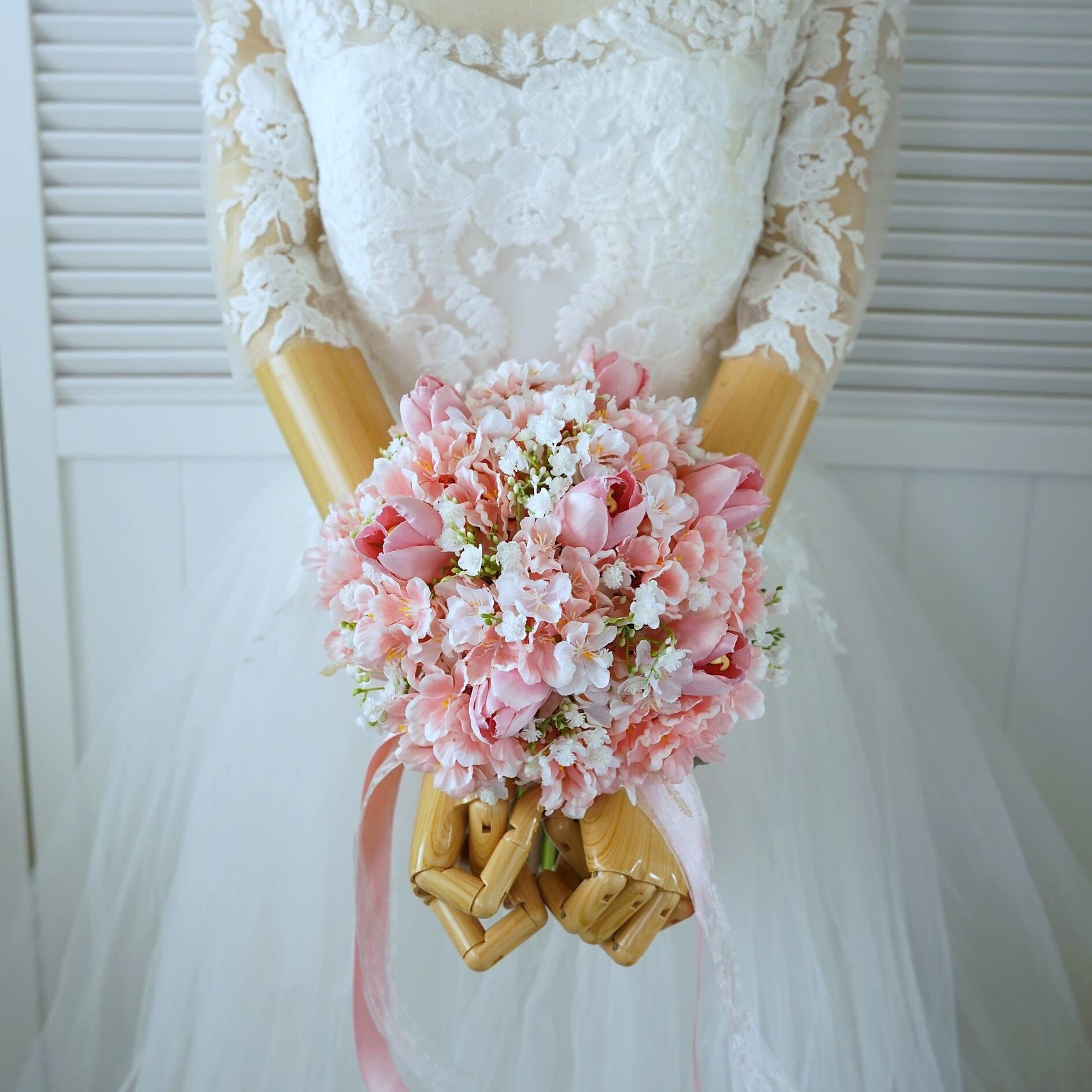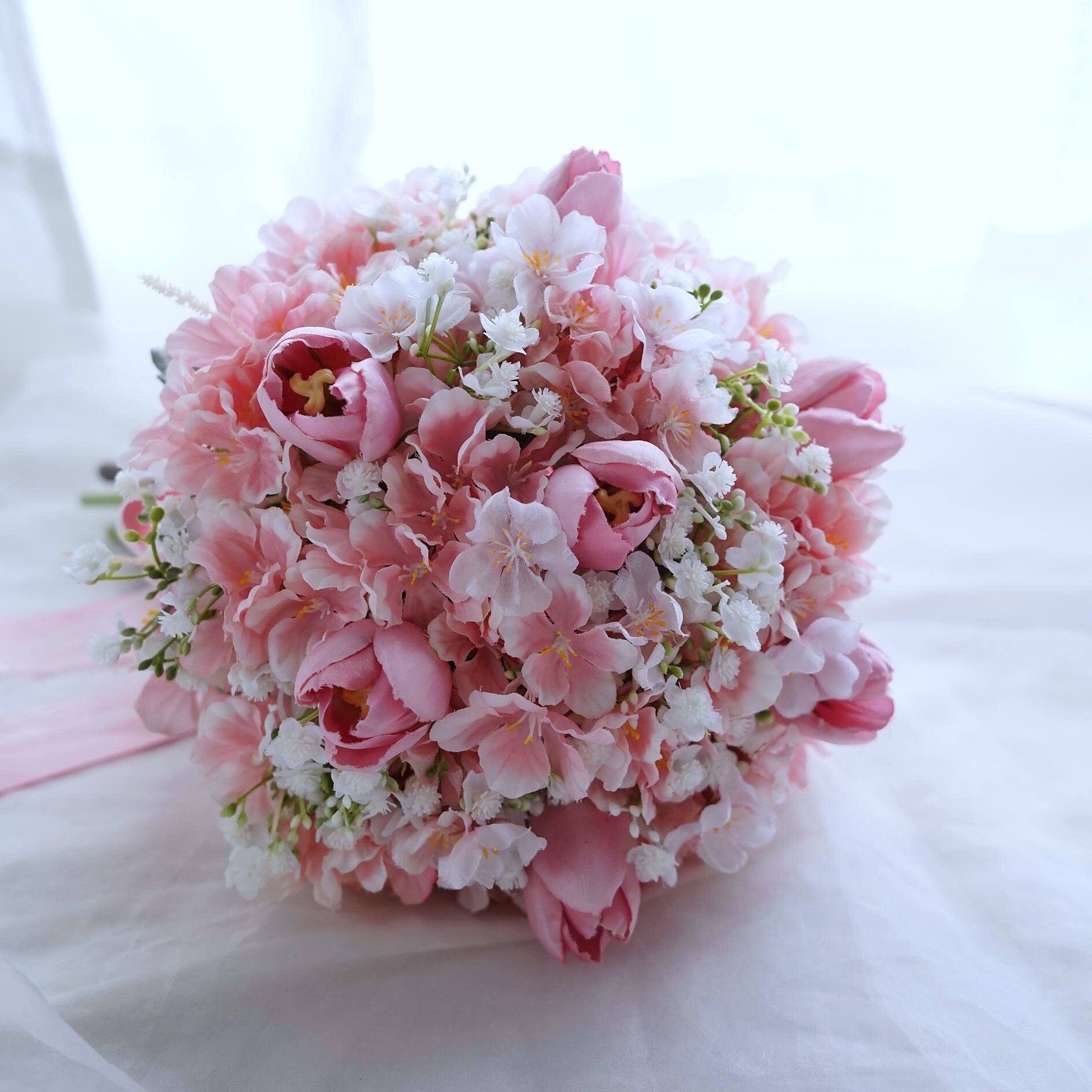 2種類の桜とチューリップ、カスミソウを合わせてラウンド型に