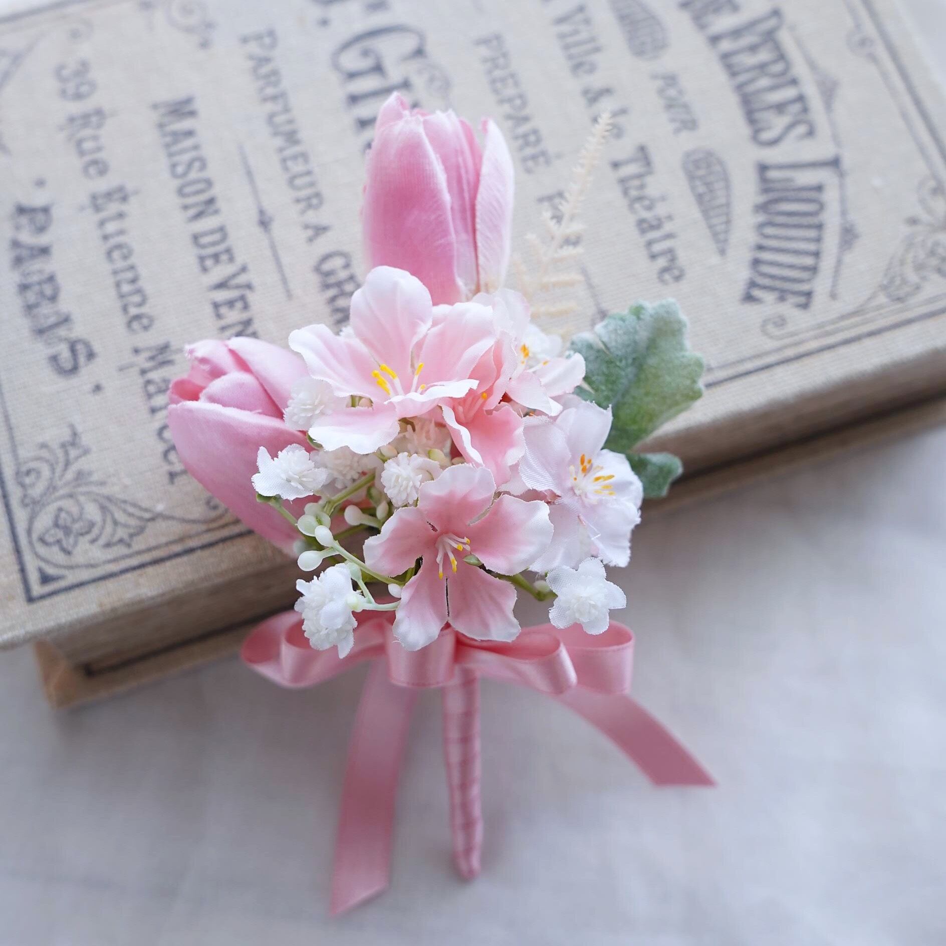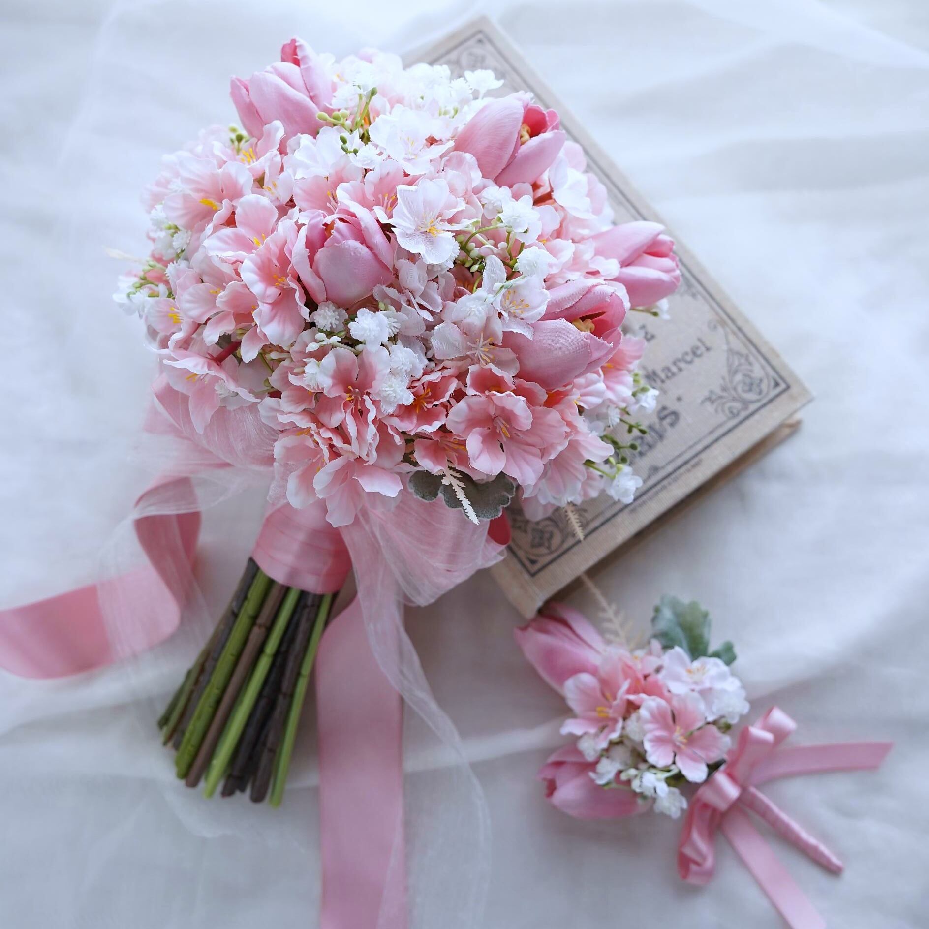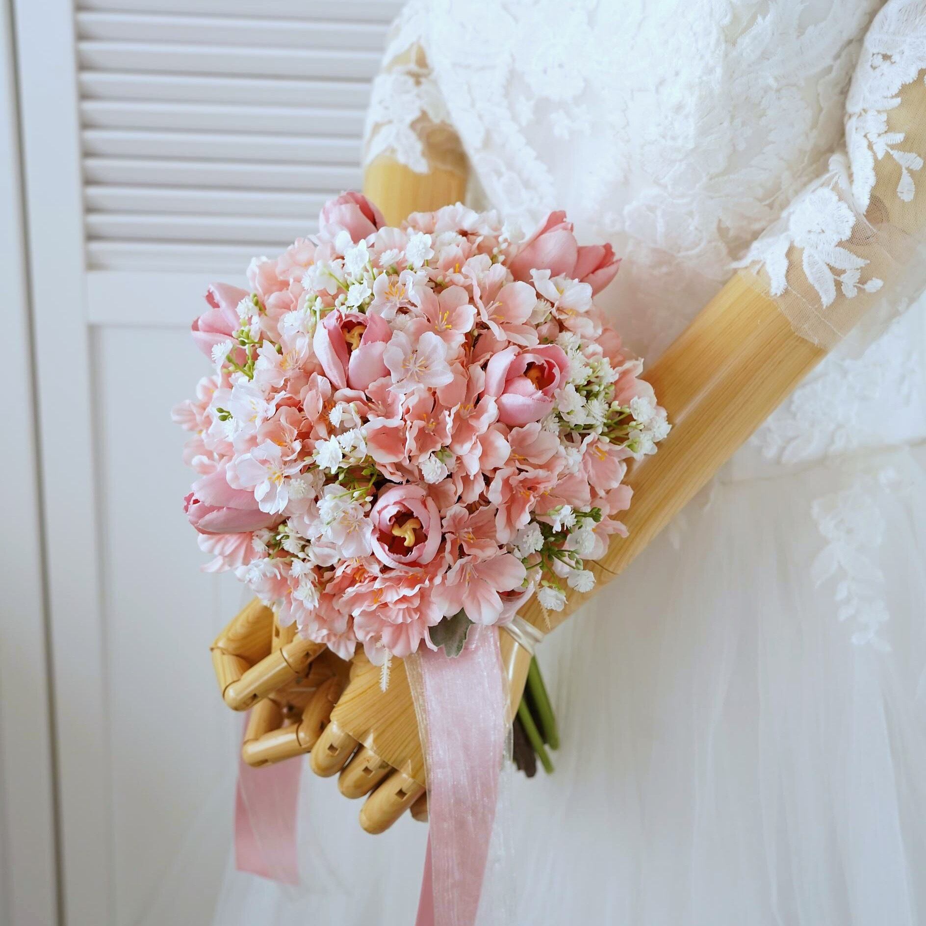 2種類の桜とチューリップ、カスミソウを合わせてラウンド型に