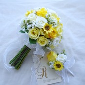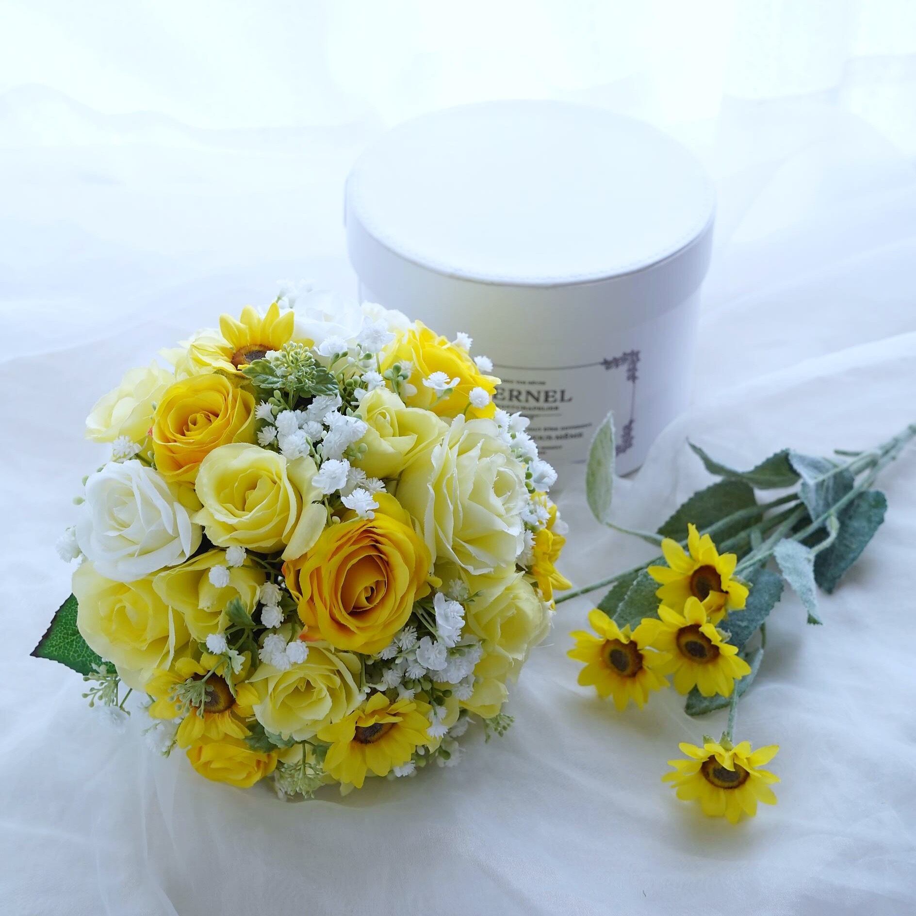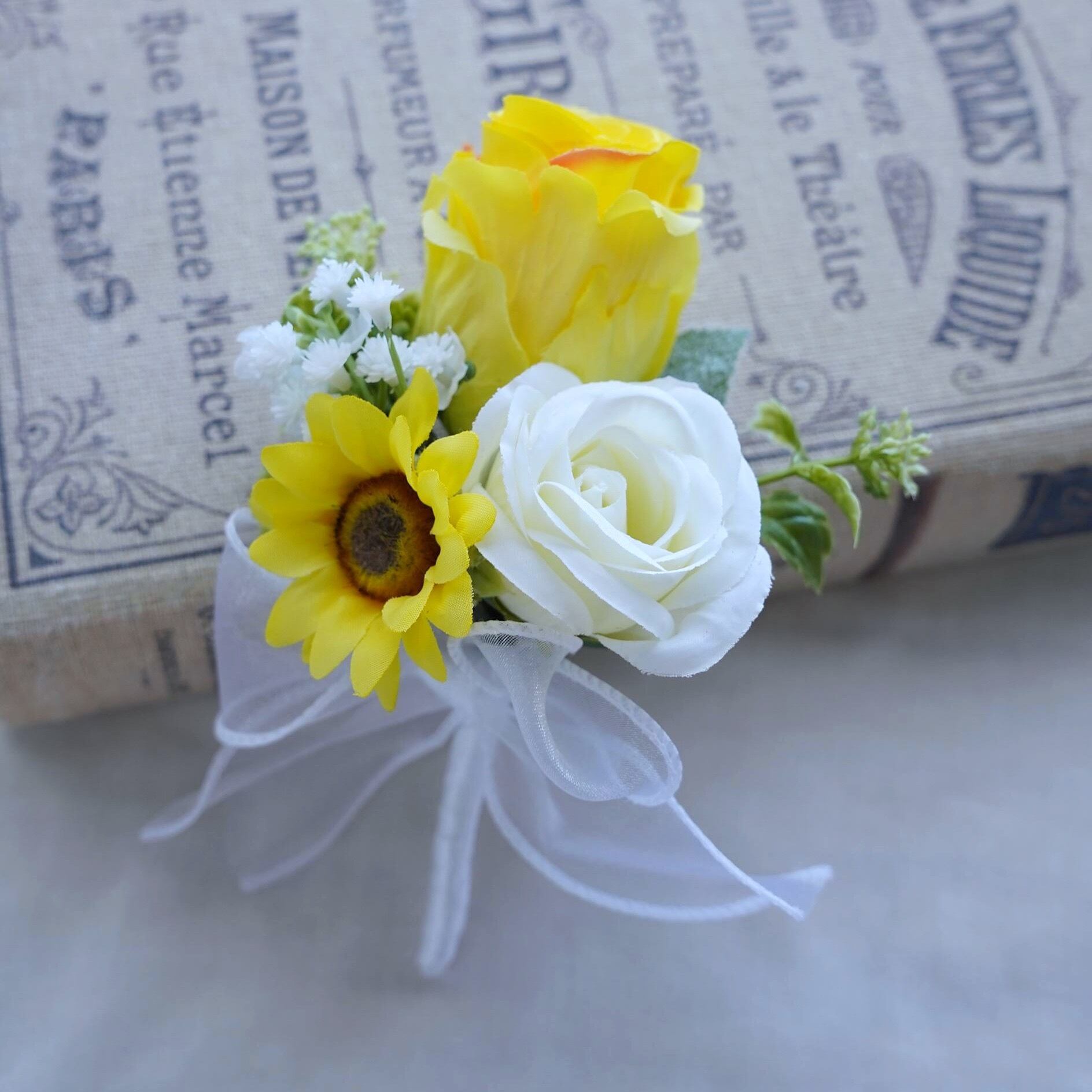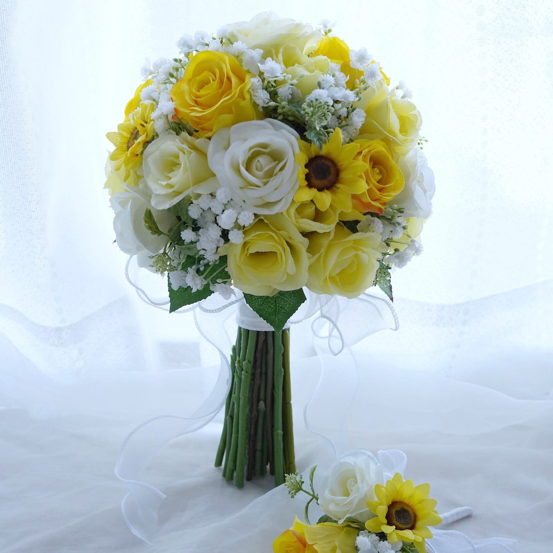 数種類の黄色のバラに白いバラとカスミソウ、小さなひまわりを